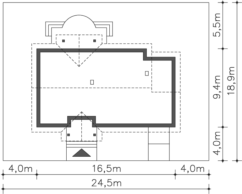 Grafika przedstawia minimalne wymiary działki. Aby sprawdzić, czy dom może być realizowany na konkretnej działce należy uzyskać Wypis i Wyrys z Miejscowego Planu Zagospodarowania Przestrzennego lub jeśli na danym terenie nie ma planu – Decyzję o warunkach zabudowy. Wszystkie projekty wymagają adaptacji do warunków miejscowych przez projektanta lokalnego.