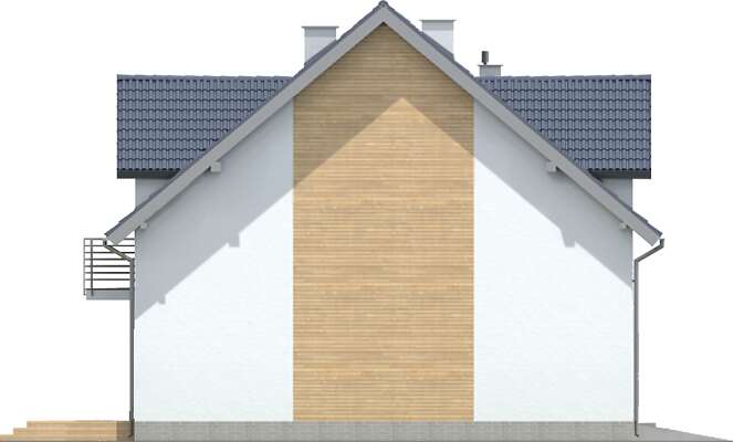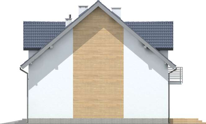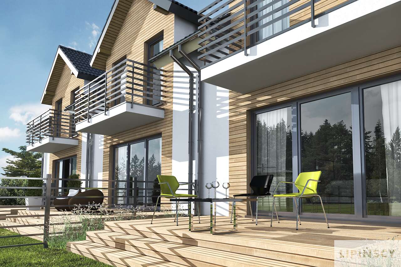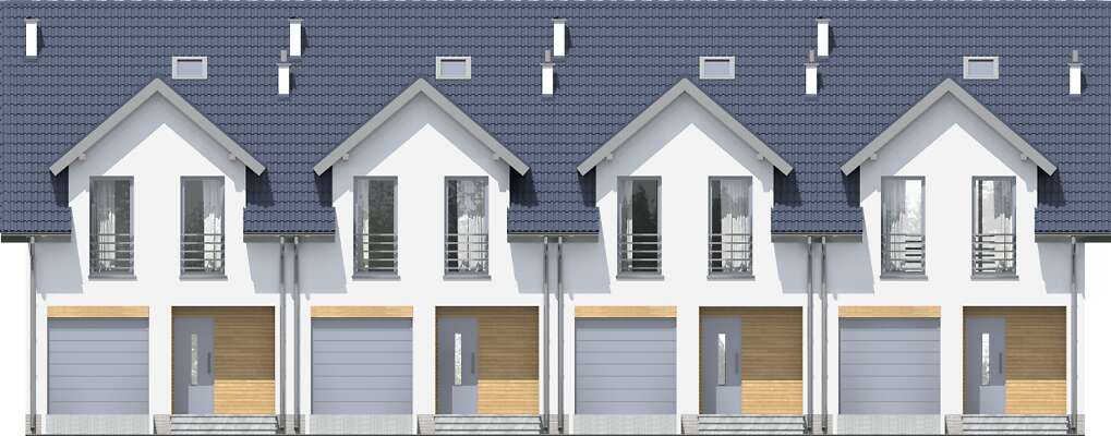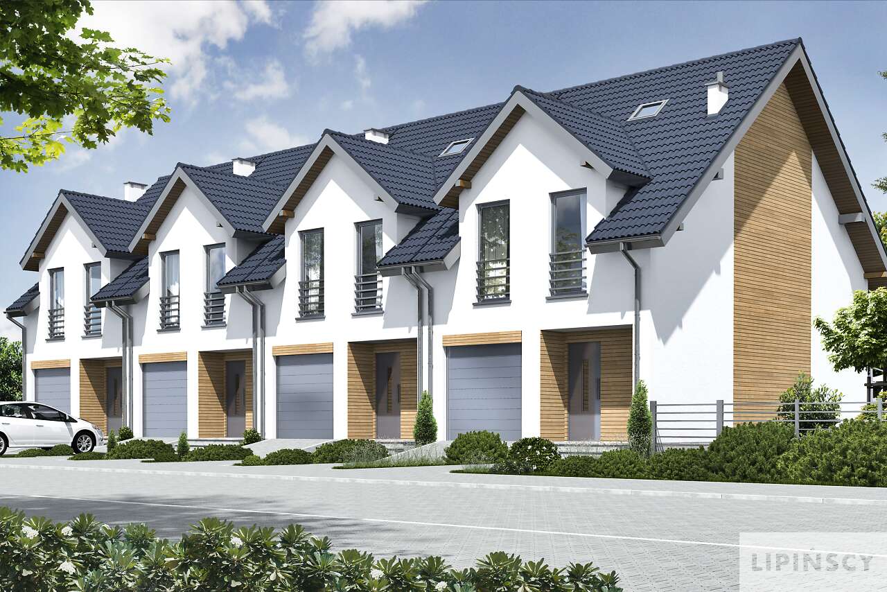 Projekt niewielkiego domu do zabudowy bliźniaczej lub szeregowej, z przeznaczeniem na niewielkie działki. Wnętrze zostało bardzo starannie rozplanowane – na parterze znajduje się salon z aneksem kuchennym i częścią jadalnianą, z którego można wyjść na taras oraz niewielka toaleta. Poddasze podzielono między dwa pokoje dla dzieci, dużą łazienkę oraz wygodną sypialnię dla rodziców. W bryłę każdego segmentu wpisano jednostanowiskowy garaż. Elegancka elewacja ma nowoczesny charakter, podkreślony elementami drewnianymi oraz metalowymi barierkami na balkonach.