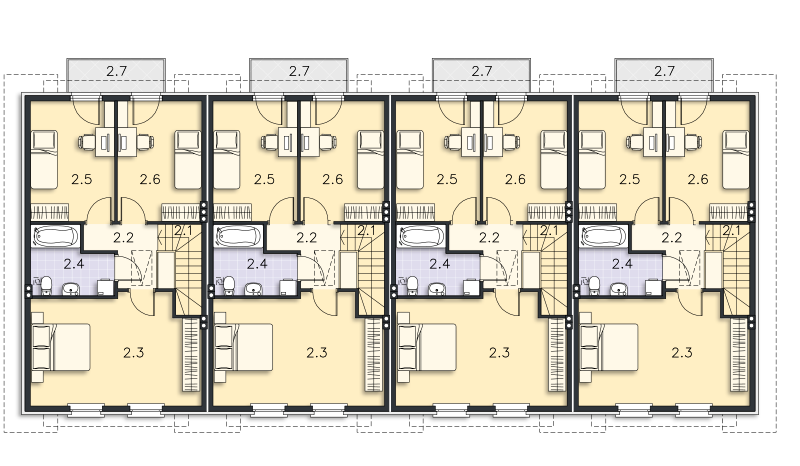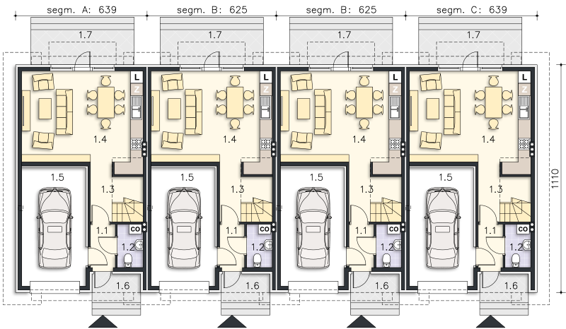 Jest to szeregówka. Cena projektu to 2090 zł za segment. Szacunkowa wycena budowy do stanu developerskiego od 218 100 zł
