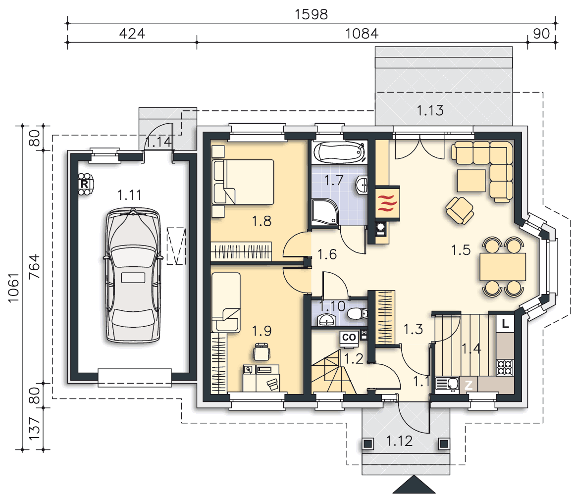 Garaż oczywiście można zlikwidować, a usytuowanie go w piwnicy będzie możliwe pod pokojem 1.9 i 1.8. Wejście do piwnicy mogłoby być w miejscu obecnej klatki schodowej, ale po likwidacji pom. 1.10