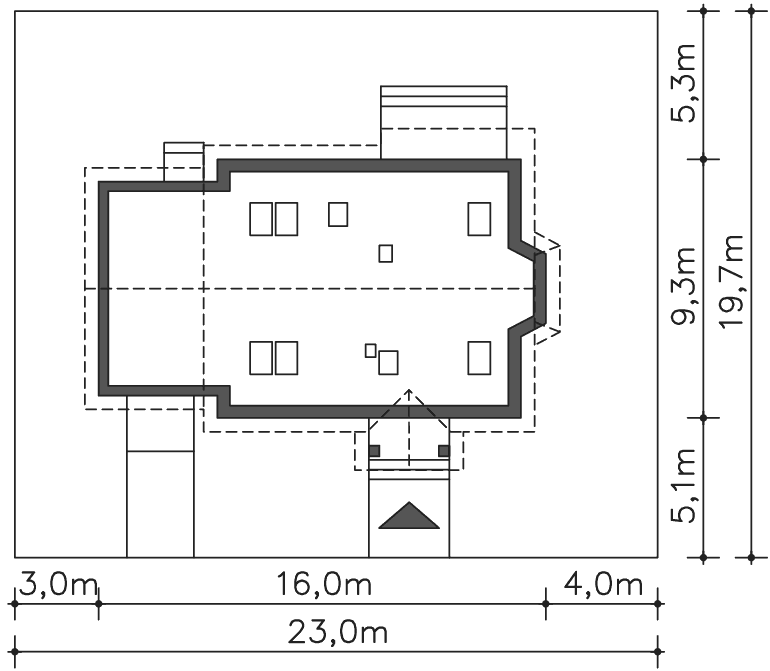 Grafika przedstawia minimalne wymiary działki. Aby sprawdzić, czy dom może być realizowany na konkretnej działce należy uzyskać Wypis i Wyrys z Miejscowego Planu Zagospodarowania Przestrzennego lub jeśli na danym terenie nie ma planu – Decyzję o warunkach zabudowy. Wszystkie projekty wymagają adaptacji do warunków miejscowych przez projektanta lokalnego.