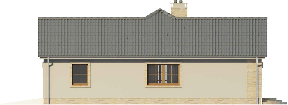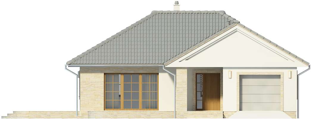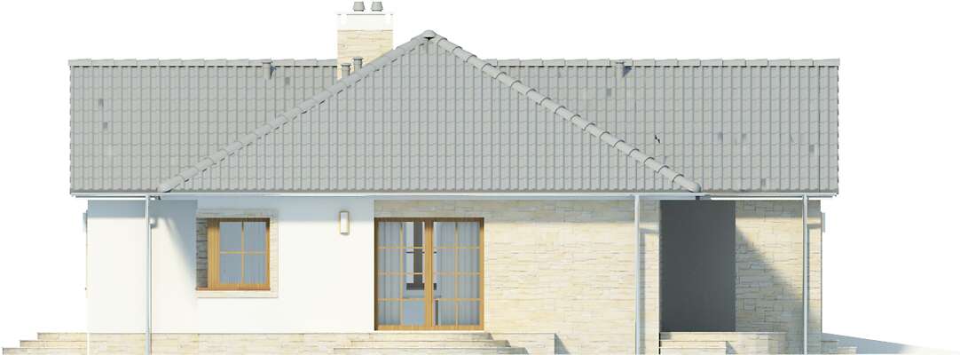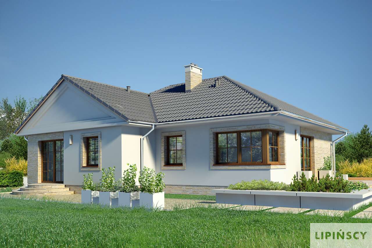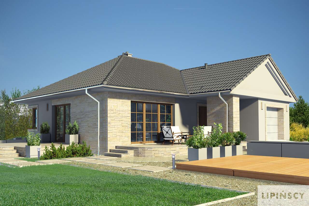 Piękny, elegancki dom o subtelnych detalach. Idealnie będzie pasował na działki z wjazdem do południa lub wschodu, dzięki części dziennej usytuowanej od frontu. Dom został zaprojektowany z myślą o 2-3 osobowej rodzinie, gdzie jedna sypialnia jest większa, a druga może pełnić rolę gabinetu i pokoju gościnnego jednocześnie. Z garażu prowadzi bezpośrednie przejście do domu przez wiatrołap, w którym jest miejsce na spore szafy. Kuchnia ma nowoczesny, wygodny układ z kuchenką na wyspie, a sąsiednie pomieszczenie gospodarcze bardzo praktyczne. Całość bryły domu, dzięki wielospadowemu dachowi jest bardzo harmonijna i nadaje mu reprezentacyjnego wyglądu.