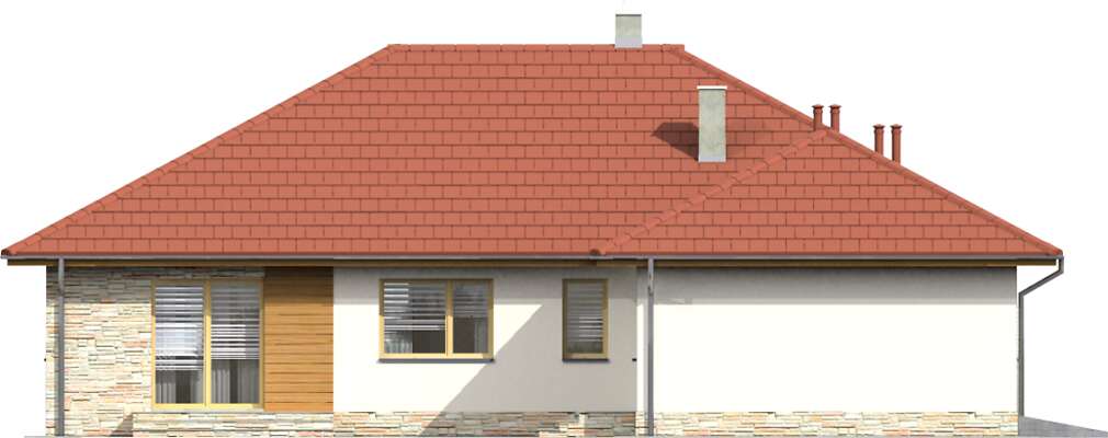 Wygodny i obszerny dom parterowy, w którym przemyślane rozplanowanie przestrzeni pozwoliło na wyodrębnienie aż 4 sypialni, gabinetu, salonu i łazienki na nieco ponad 150m². Dodatkowo zaplanowano także garderobę, spiżarnię, osobne wc i kotłownię. Z wnętrza domu prowadzi przejście do wkomponowanego w bryłę garażu na dwa auta. Usytuowane w niewielkim podcieniu wejście osłania wiatrołap przed deszczem i wiatrem. Dom jest idealny dla potrzeb 4-5 osobowej rodziny, która – oprócz części wspólnej, będzie miała do dyspozycji własny pokój. Wielospadowy dach przekrywa połączone ze sobą dwie proste bryły domu i garażu, co nadaje budynkowi stylowy wygląd i pozwoli na bezproblemową realizację.