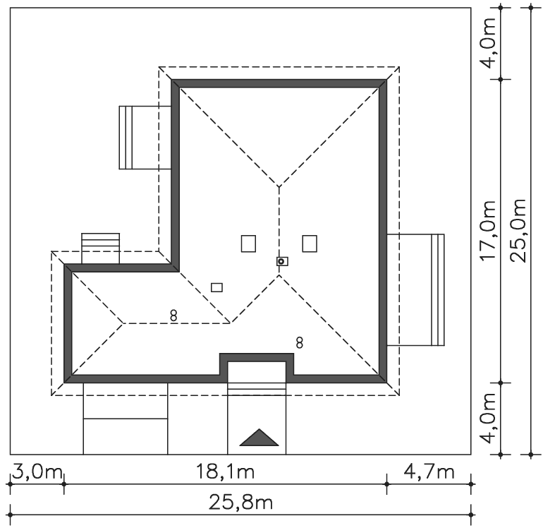 Grafika przedstawia minimalne wymiary działki. Aby sprawdzić, czy dom może być realizowany na konkretnej działce należy uzyskać Wypis i Wyrys z Miejscowego Planu Zagospodarowania Przestrzennego lub jeśli na danym terenie nie ma planu – Decyzję o warunkach zabudowy. Wszystkie projekty wymagają adaptacji do warunków miejscowych przez projektanta lokalnego.