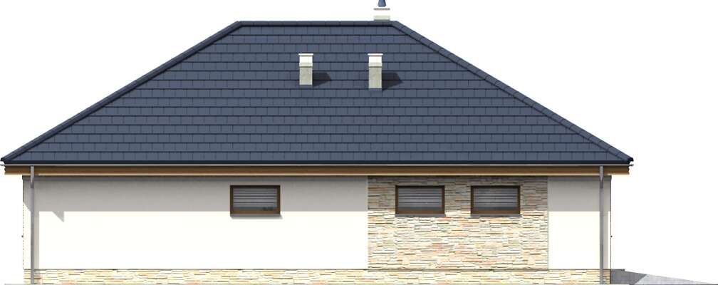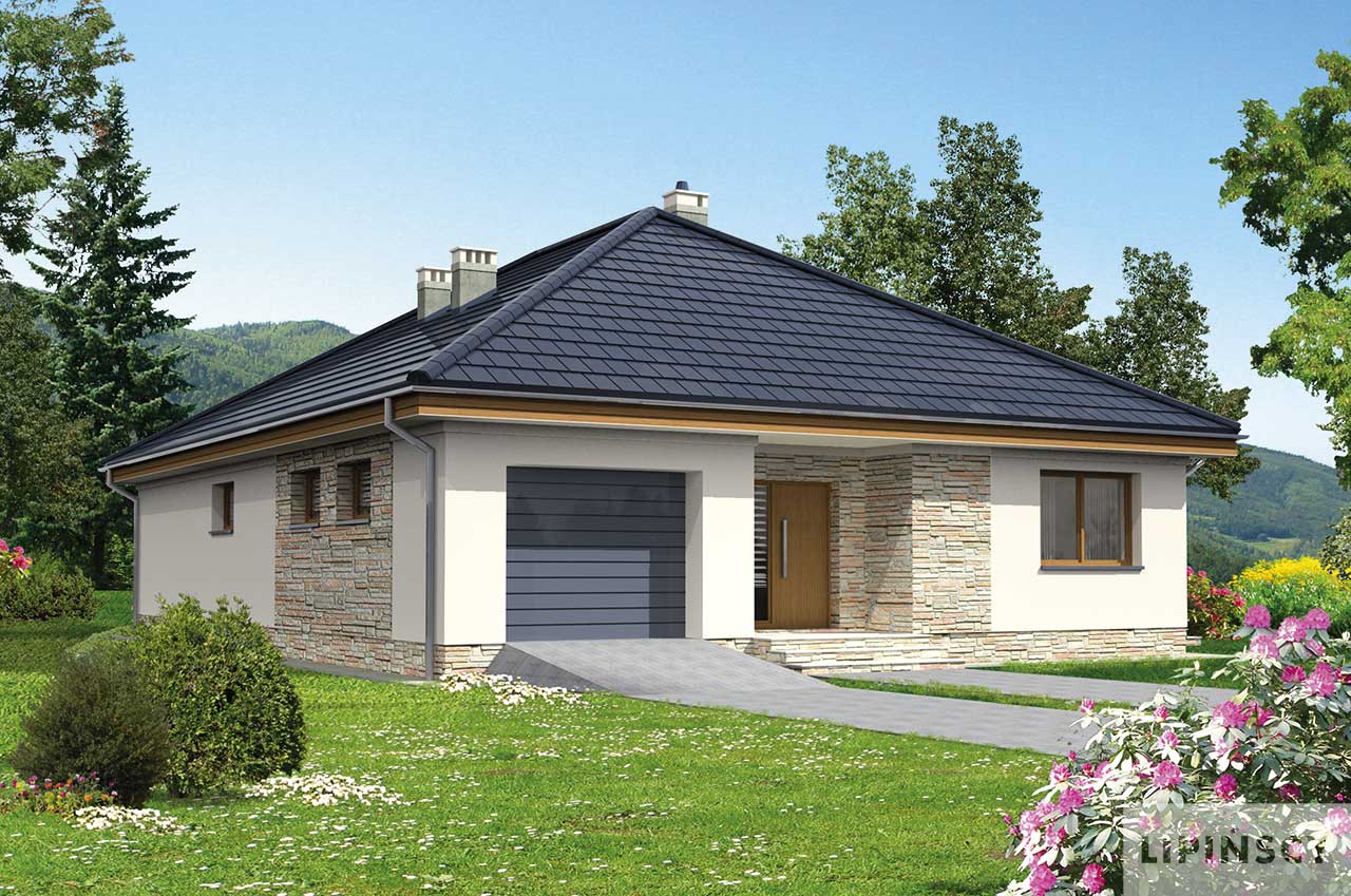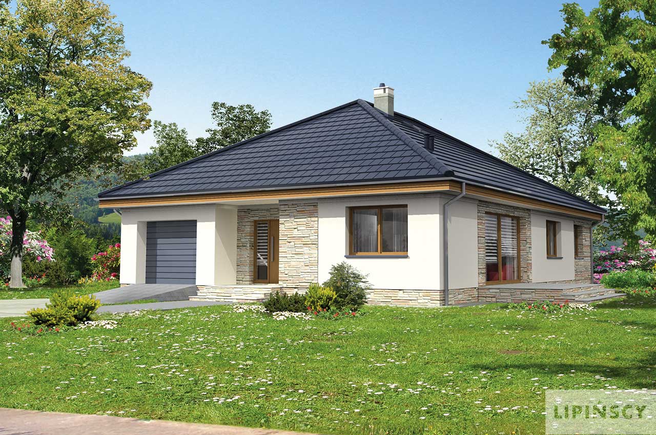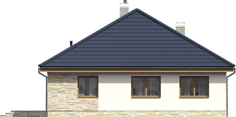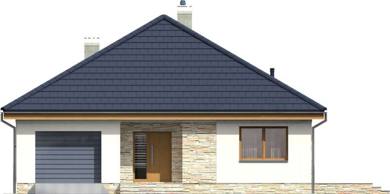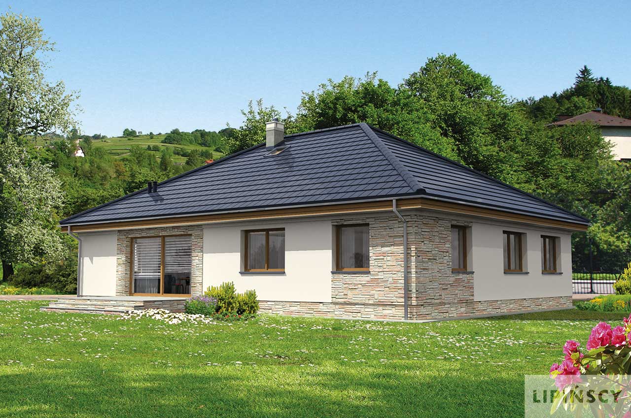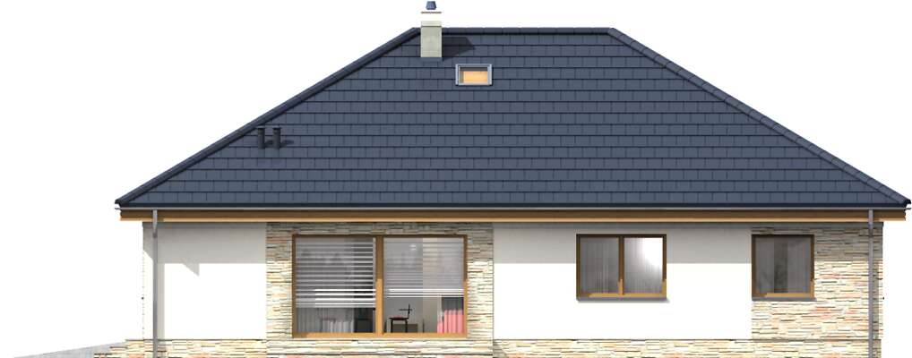 Wygodny dom parterowy, o zwartej bryle i prostej konstrukcji. Projekt domu Lizbona dedykowany jest dla miłośników dachów kopertowych. Mieszkańcy mają do dyspozycji otwartą kuchnię ze spiżarką, salon z kominkiem i wyjściem na taras, cztery sypialnie, łazienkę i wc. W bryłę wpisano garaż na jedno auto, z przejściem do kotłowni. Uwagę zwraca ciekawie zaaranżowane wejście do budynku w niewielkim podcieniu. Taras zlokalizowano z boku domu, co daje możliwość lokalizacji domu z wjazdem nie tylko od północy, ale też od wschodu lub zachodu. Propozycja aranżacji elewacji projektu domu Lizbona opiera się na jasnym tynku przeplatanym również jasną okładziną kamienną. Uzupełnieniem świetlistej elewacji jest grafitowy dach, dzięki czemu dom charakteryzuje się bardzo eleganckim wyglądem. Lizbona spodoba się zarówno miłośnikom tradycyjnym rozwiązań, jak i tym skłaniającym się ku nowoczesności. W projekcie przewidziano ogrzewanie kotłem na gaz. Możliwa jest zmiana ogrzewania na pompę ciepła.