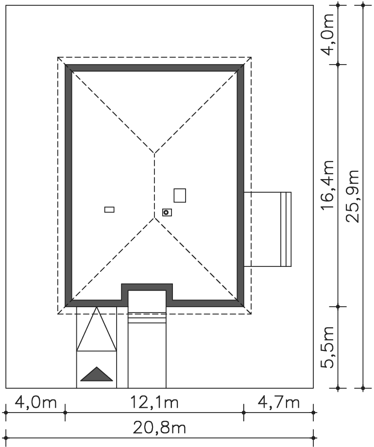 Grafika przedstawia minimalne wymiary działki. Aby sprawdzić, czy dom może być realizowany na konkretnej działce należy uzyskać Wypis i Wyrys z Miejscowego Planu Zagospodarowania Przestrzennego lub jeśli na danym terenie nie ma planu – Decyzję o warunkach zabudowy. Wszystkie projekty wymagają adaptacji do warunków miejscowych przez projektanta lokalnego.