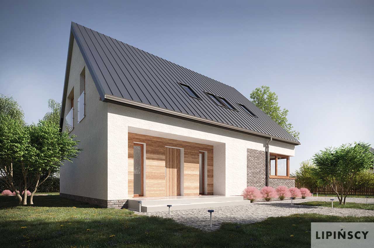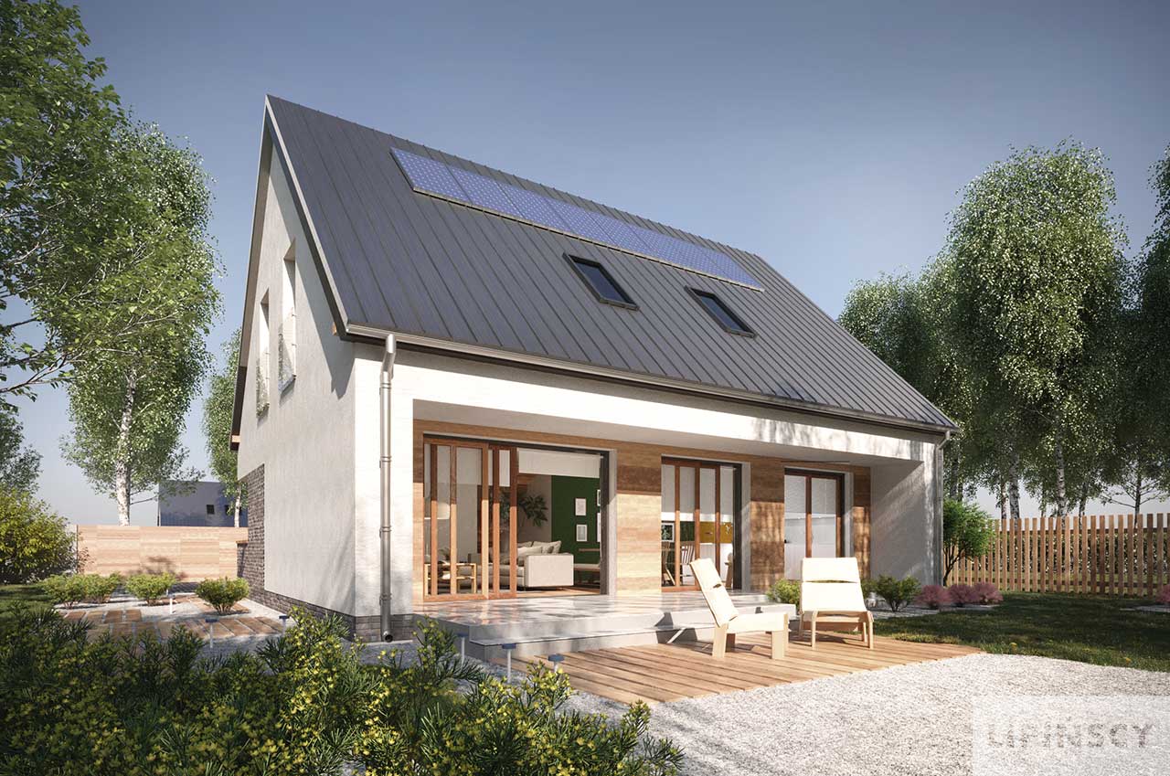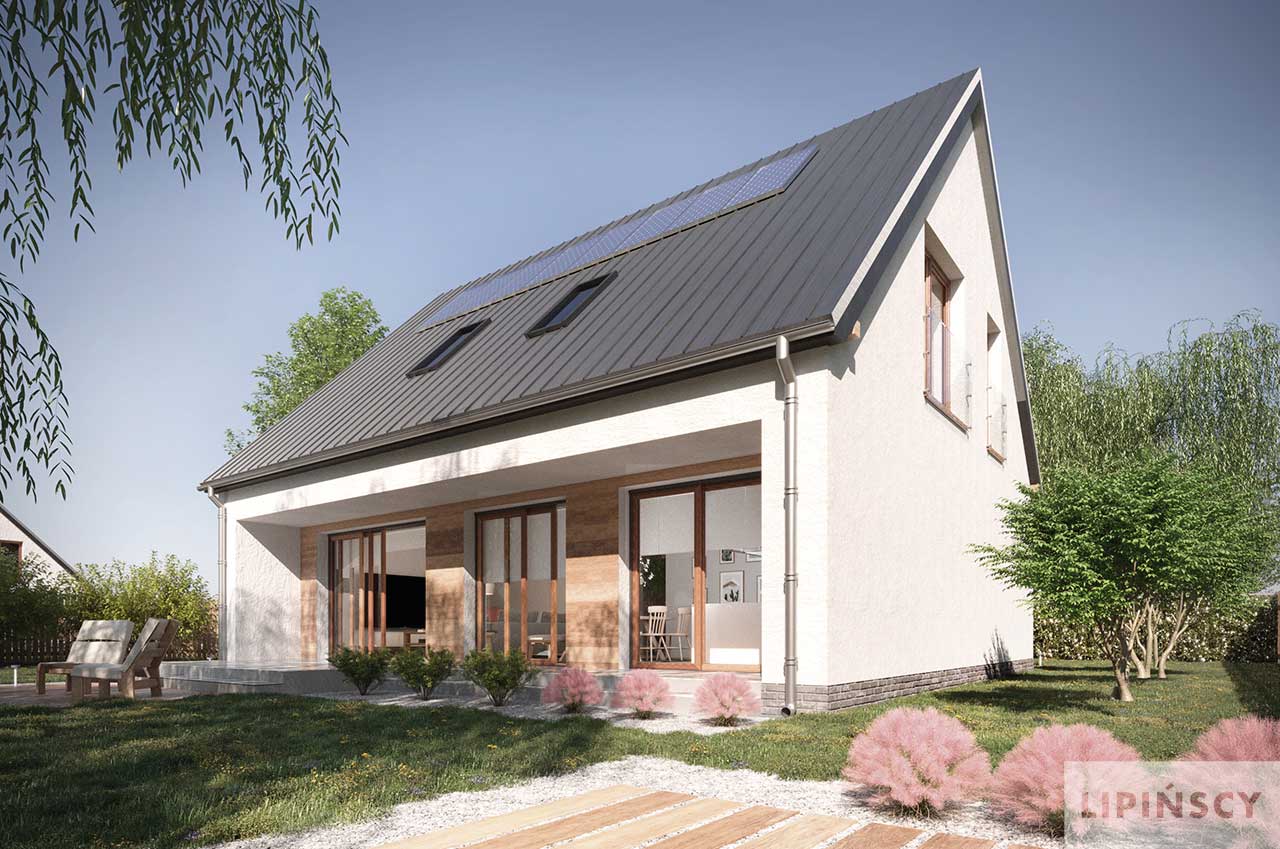 Energooszczędny, kompaktowy dom z poddaszem pod dwuspadowym dachem, w nowoczesnym stylu. Otwarta strefa dzienna mieszcząca kuchnię z wyspą, jadalnię i przestrzeń salonu jest otwarta na ogród na tyłach domu. Niegłębokie zadaszenie tarasu pozwoli na odpowiedni dostęp światła zarówno w zimie, jak i w lecie. Obok schowanych schodów zlokalizowany jest gabinet z narożnym oknem, a przy wejściu znajduje się wc i pomieszczenie techniczne. Na poddaszu znalazło się miejsce na trzy sypialnie, łazienkę i pralnię. W projekcie przewidziano ogrzewanie pompą ciepła.