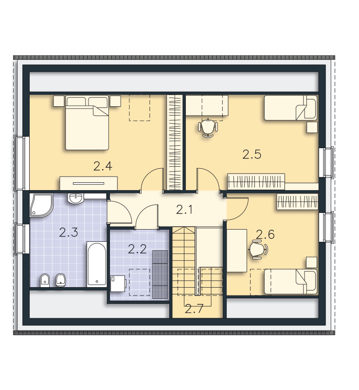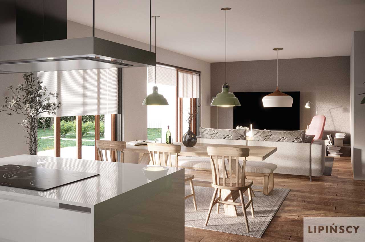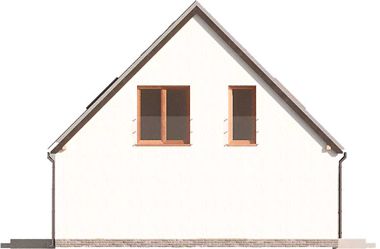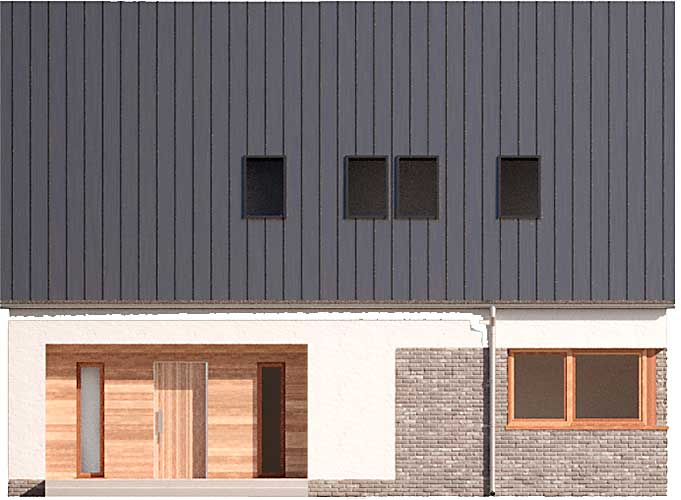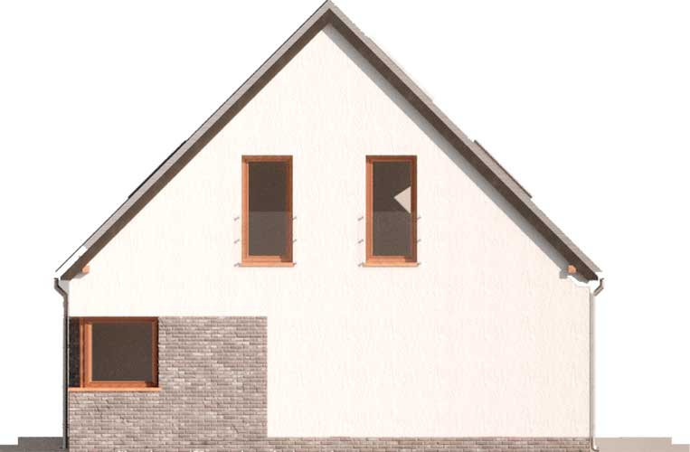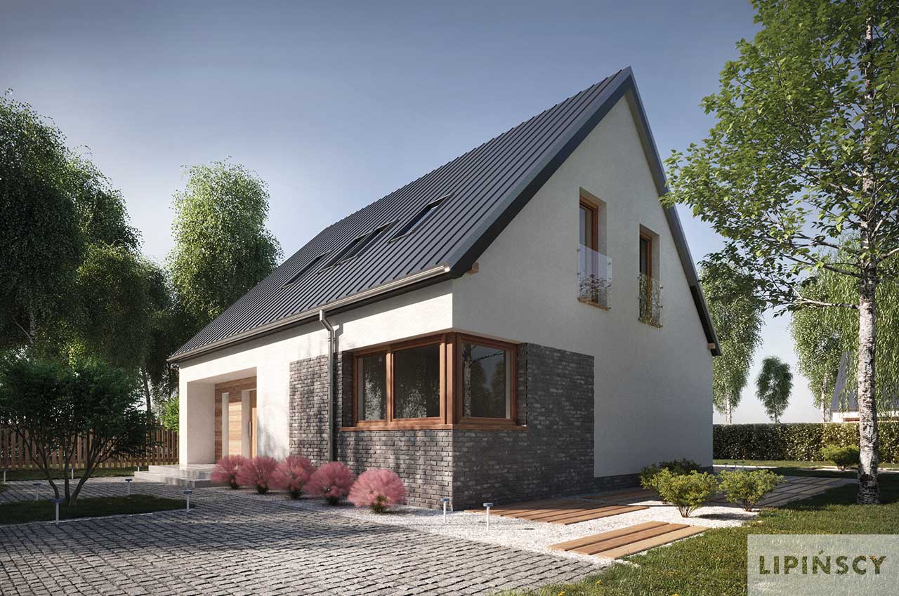 Energooszczędny, kompaktowy dom z poddaszem pod dwuspadowym dachem, w nowoczesnym stylu. Otwarta strefa dzienna mieszcząca kuchnię z wyspą, jadalnię i przestrzeń salonu jest otwarta na ogród na tyłach domu. Niegłębokie zadaszenie tarasu pozwoli na odpowiedni dostęp światła zarówno w zimie, jak i w lecie. Obok schowanych schodów zlokalizowany jest gabinet z narożnym oknem, a przy wejściu znajduje się wc i pomieszczenie techniczne. Na poddaszu znalazło się miejsce na trzy sypialnie, łazienkę i pralnię. W projekcie przewidziano ogrzewanie pompą ciepła.