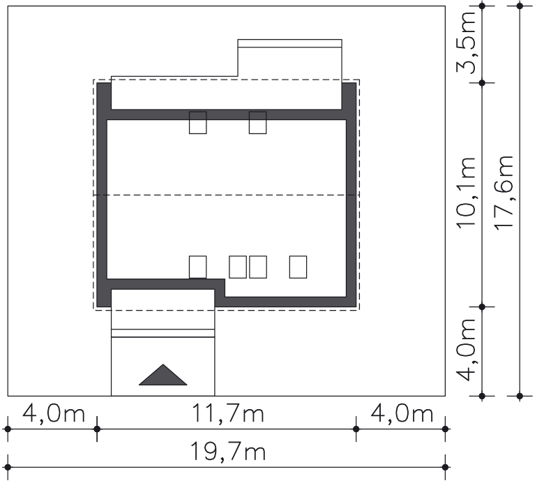 Grafika przedstawia minimalne wymiary działki. Aby sprawdzić, czy dom może być realizowany na konkretnej działce należy uzyskać Wypis i Wyrys z Miejscowego Planu Zagospodarowania Przestrzennego lub jeśli na danym terenie nie ma planu – Decyzję o warunkach zabudowy. Wszystkie projekty wymagają adaptacji do warunków miejscowych przez projektanta lokalnego.