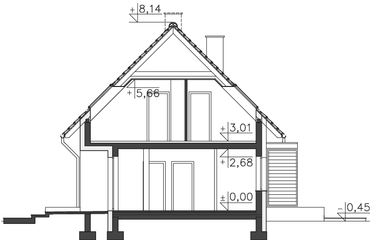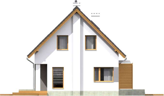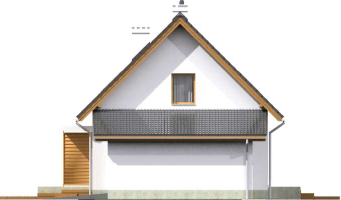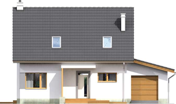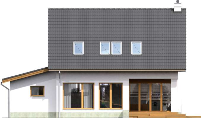 Elegancki dom z użytkowym poddaszem, który dzięki zastosowaniu energooszczędnej technologii, z pewnością będzie niedrogi w eksploatacji. Parter to strefa dzienna, do której należy połączona z salonem kuchnia, łazienka, osobny pokój, mogący służyć jako sypialnia dla gości lub gabinet i kotłownia. Poddasze podzielono na trzy sypialnie i dużą, wygodną łazienkę. Duże przeszklenia nie tylko wpuszczają do domu dużo dziennego światła, ale wpływają także na to, że wnętrze wydaje się większe niż w rzeczywistości.
