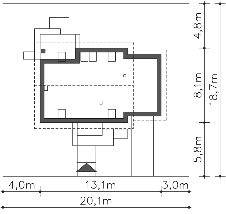 Grafika przedstawia minimalne wymiary działki. Aby sprawdzić, czy dom może być realizowany na konkretnej działce należy uzyskać Wypis i Wyrys z Miejscowego Planu Zagospodarowania Przestrzennego lub jeśli na danym terenie nie ma planu – Decyzję o warunkach zabudowy. Wszystkie projekty wymagają adaptacji do warunków miejscowych przez projektanta lokalnego.