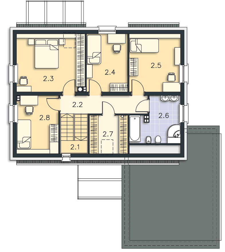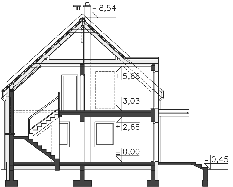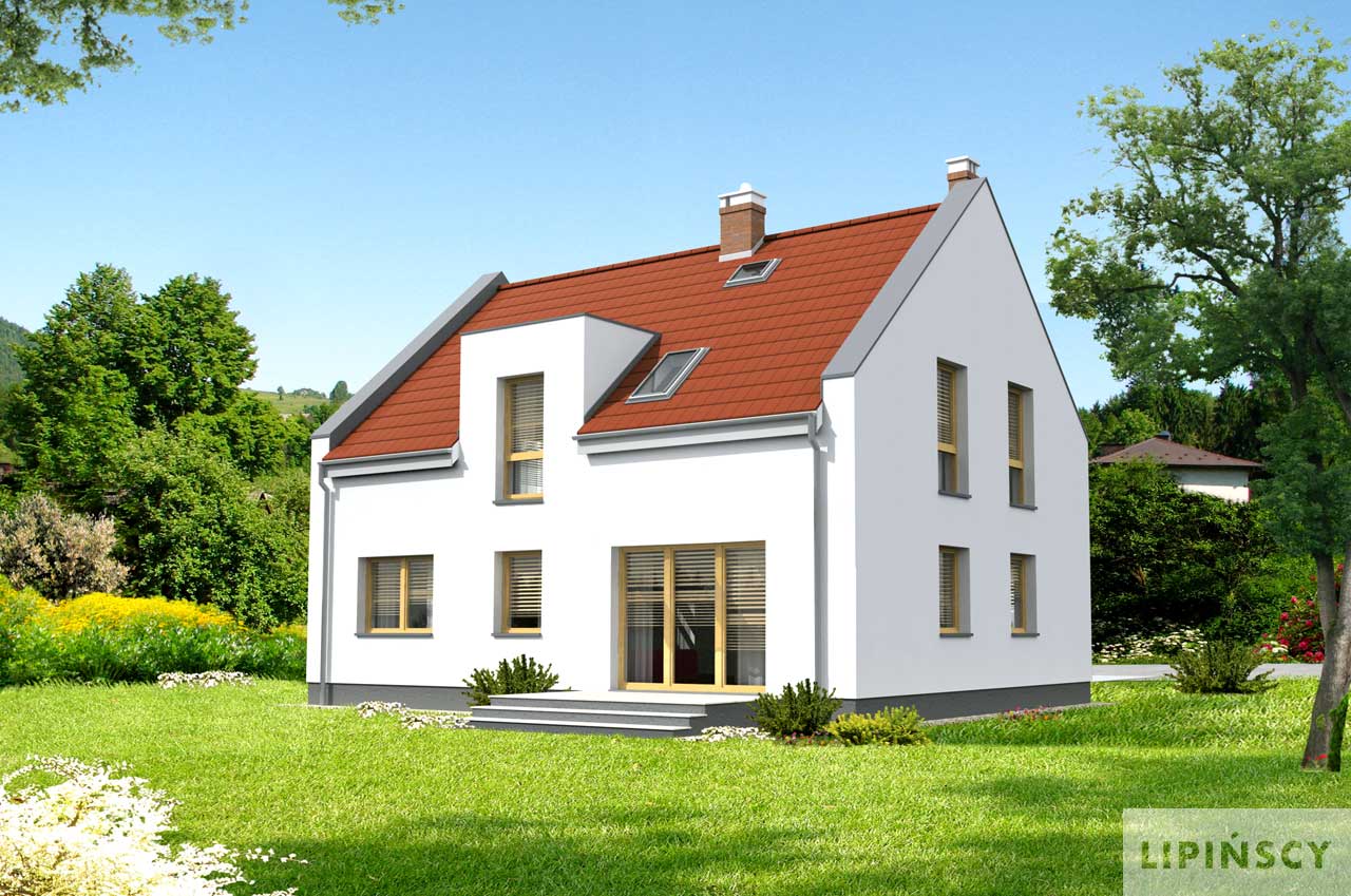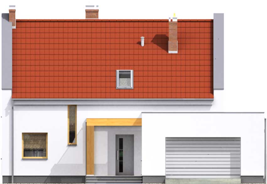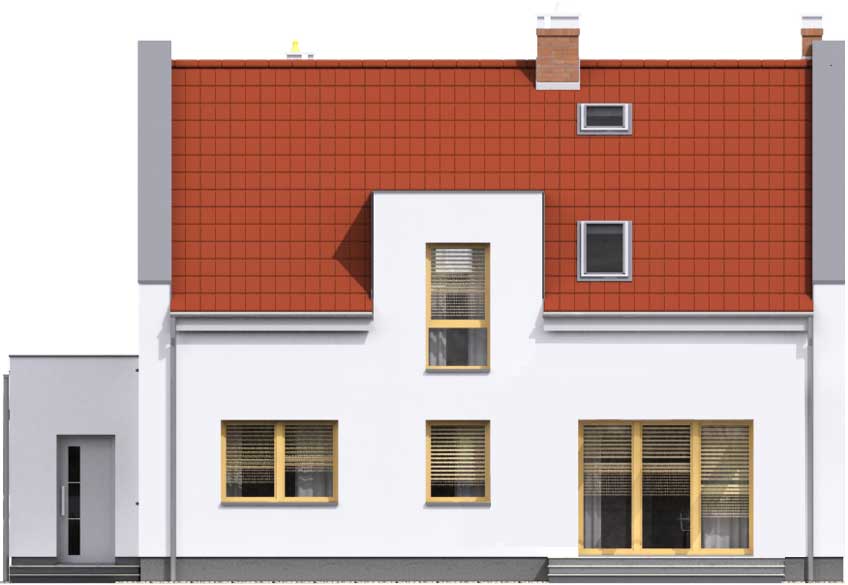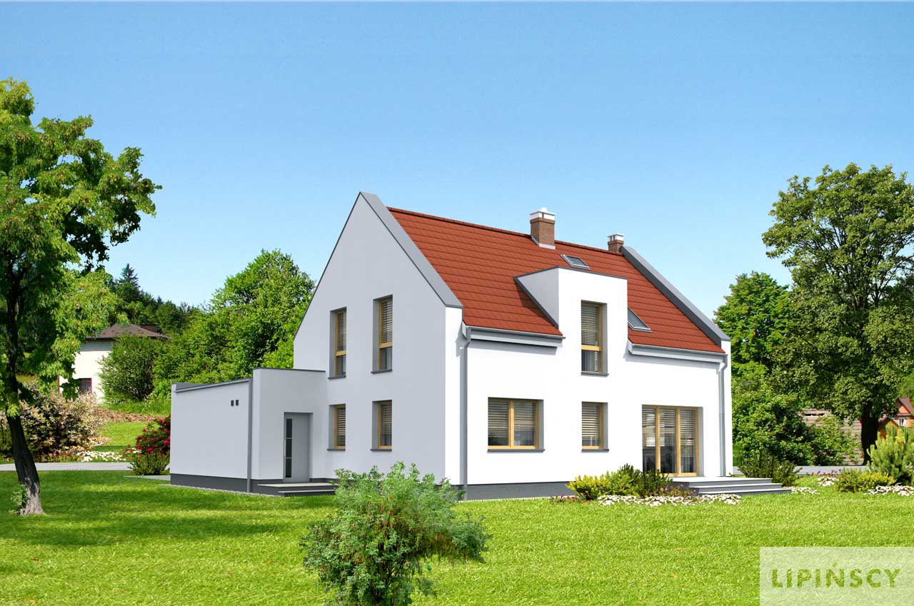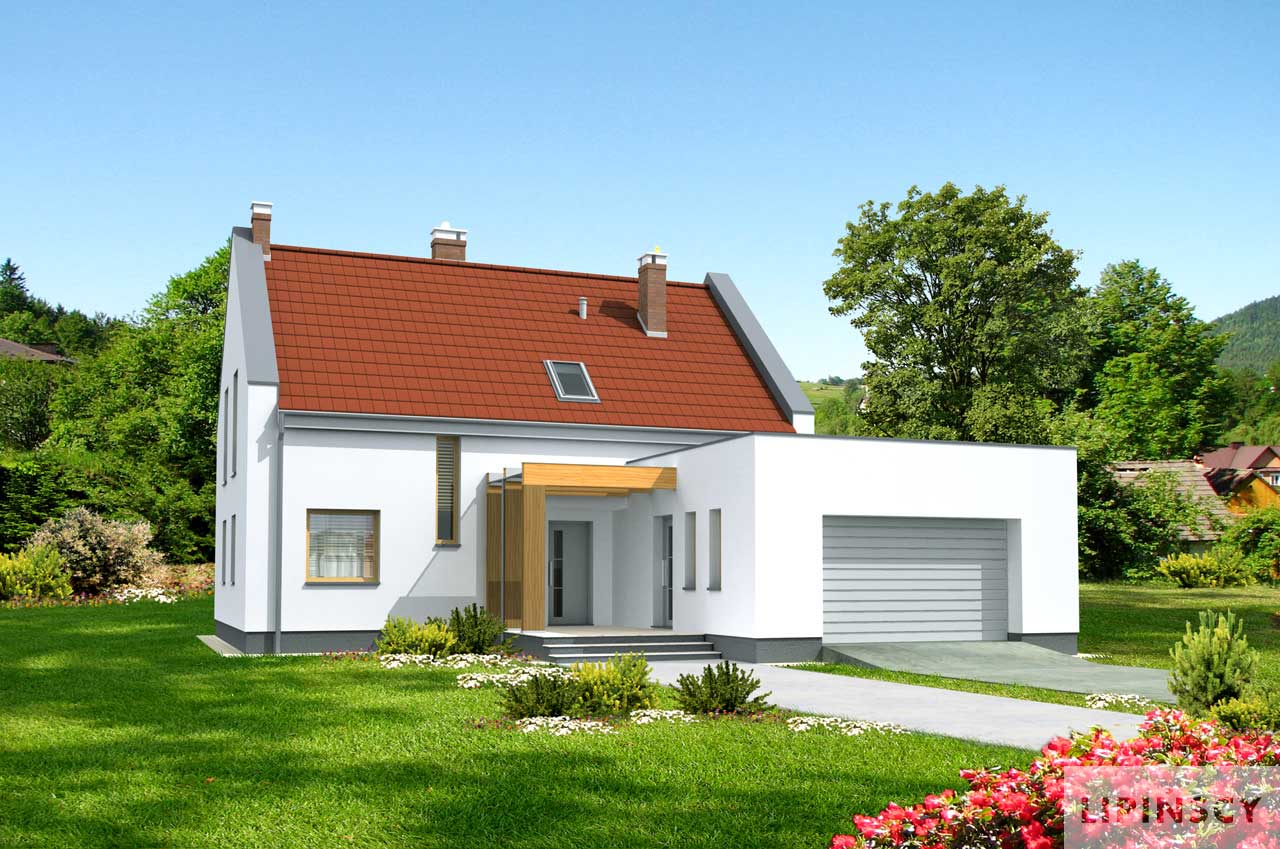 Elegancki dom o prostej formie zamkniętej dwuspadowym dachem. Biała elewacja bez ozdobników, brak okapu oraz płaski dach nad wysuniętym do przodu dwustanowiskowym garażem nadają domowi charakterystyczny nowoczesny wygląd. Bogaty program funkcjonalny w tym 5 sypialni oraz pomieszczenia funkcyjne są niezaprzeczalnymi atutami tego domu. 30m² salon z kominkiem oraz otwartą kuchnią, którą można łatwo wydzielić, tworzy wygodną strefę dzienną powiększoną o obszerne przeszklenie tarasowe.