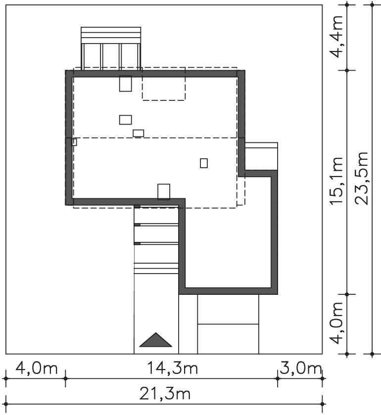 Grafika przedstawia minimalne wymiary działki. Aby sprawdzić, czy dom może być realizowany na konkretnej działce należy uzyskać Wypis i Wyrys z Miejscowego Planu Zagospodarowania Przestrzennego lub jeśli na danym terenie nie ma planu – Decyzję o warunkach zabudowy. Wszystkie projekty wymagają adaptacji do warunków miejscowych przez projektanta lokalnego.
