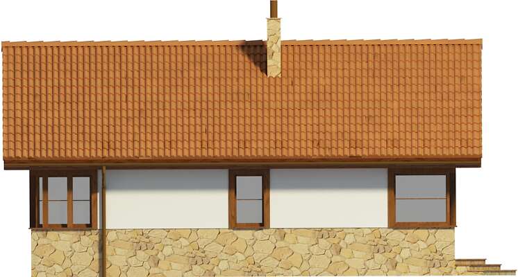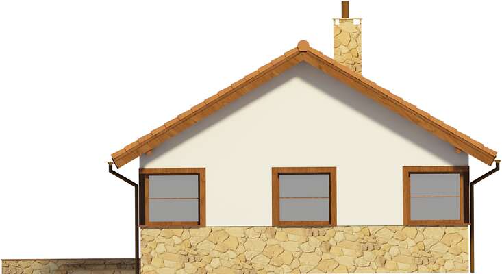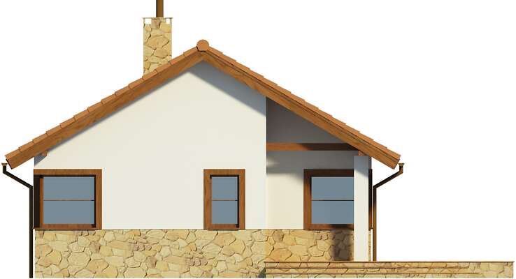 Prosty dom parterowy – połączenie ładnego wyglądu z niewielkim, ale wygodnie zaplanowanym wnętrzem. Doskonała propozycja dla pary seniorów lub małej rodziny. Wnętrze kryje kuchnię, spiżarnię, salon z kominkiem, łazienkę i trzy niewielkie sypialnie. Ciekawie zaaranżowane, częściowo zadaszone wejście i taras z przodu budynku można wykorzystać jako idealne miejsce na wstawienie mebli ogrodowych by cieszyć się posiłkami na świeżym powietrzu. Ozdobą domu są narożne okna, nadające budynkowi lekkości.
