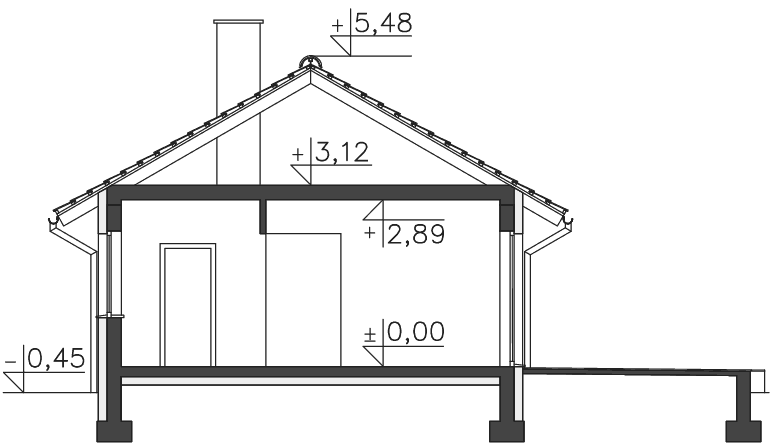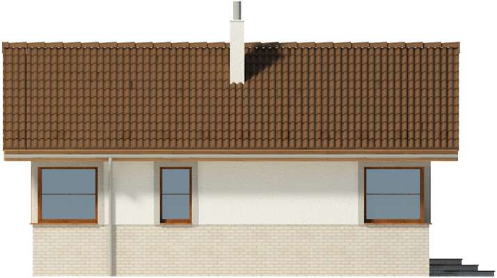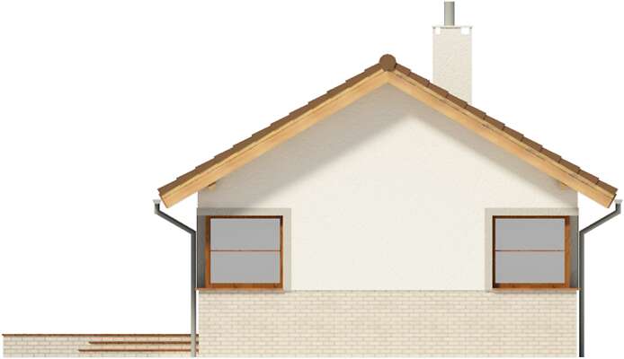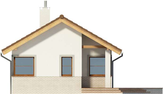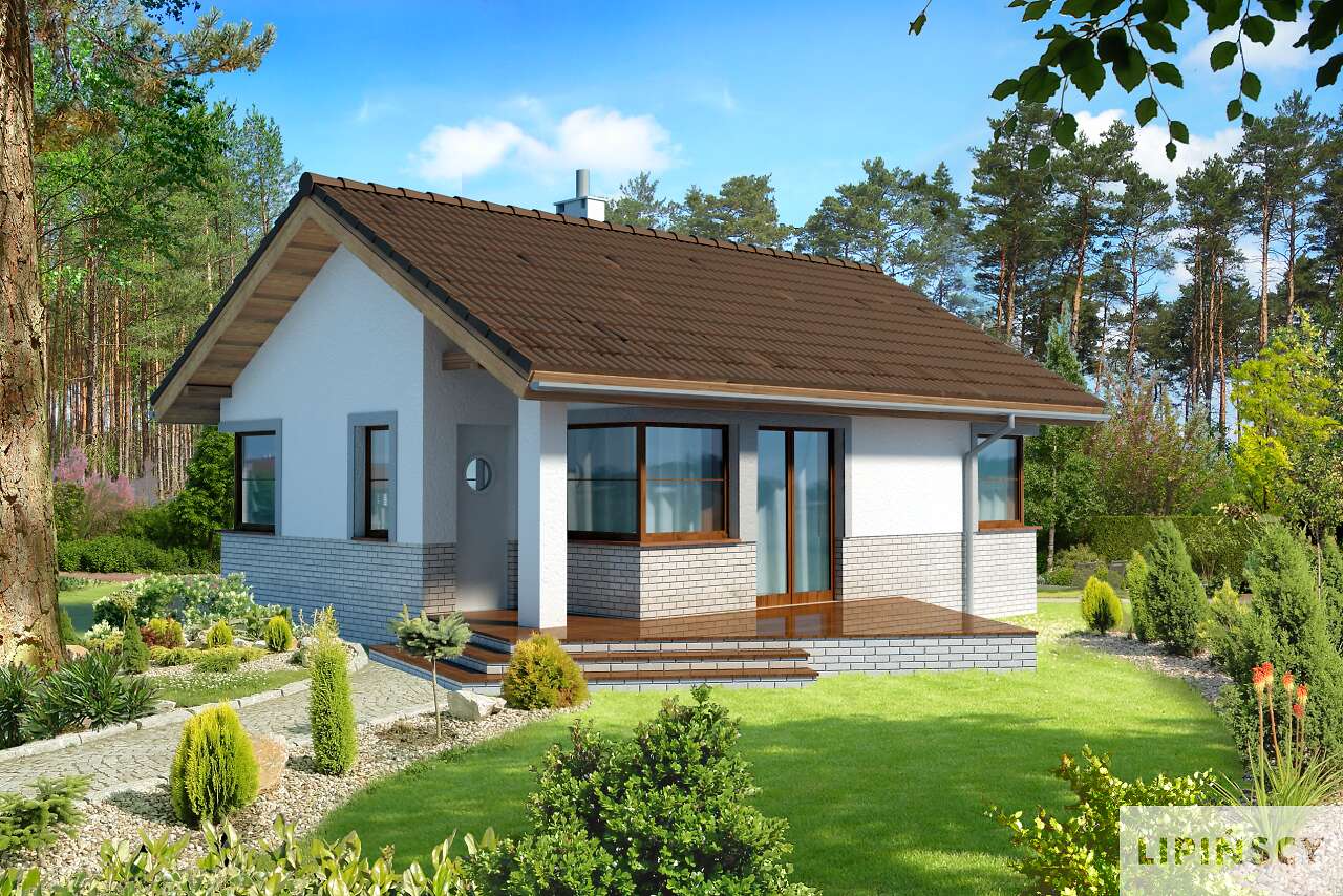 Malutki, uroczy domek parterowy, doskonały dla seniorów. Na niewielkiej, lecz doskonale rozplanowanej przestrzeni znajduje się salon z wyjściem na taras, kuchnia ze spiżarką, dwie sypialnie i łazienka z wc. Uwagę zwraca lekka bryła budynku, z ciekawie zaprojektowanym wejściem i narożnymi oknami, którą przekrywa prosty, dwuspadowy dach. Dzięki prostej konstrukcji dom jest niedrogi w wykonaniu.