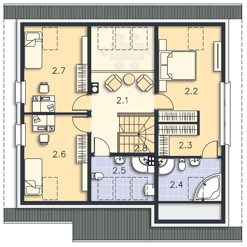 Ciekawy projekt z dużą ilościa przeszkleń na parterze, kominek w środku domu pozwoli na pewno na dość równomierne rozprowadzenie ciepła, duży plus za spiżarkę (chociaż jest malutka, ale jest).Sądząc po równym podziale pomieszczeń na poddaszu pewnie mozliwa jest zamiana np części prawej z lewą co też stanowi duży plus. Okna dachowe nad jadalnią poprzez pustkę w stropie z pewnością dadzą dużo światła.Od strony pokoi 2.6 i 2.7 widziałbym duży balkon łączący oba okna.