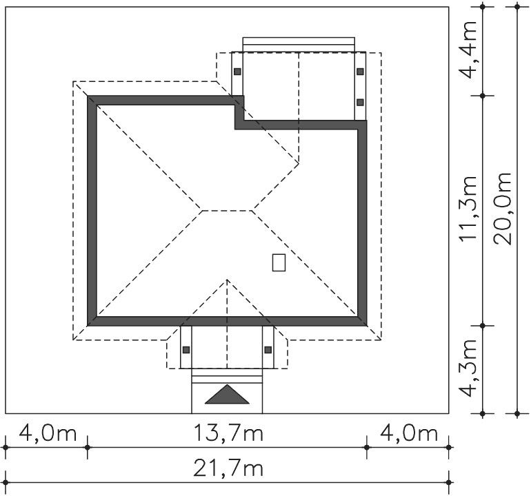 Grafika przedstawia minimalne wymiary działki. Aby sprawdzić, czy dom może być realizowany na konkretnej działce należy uzyskać Wypis i Wyrys z Miejscowego Planu Zagospodarowania Przestrzennego lub jeśli na danym terenie nie ma planu – Decyzję o warunkach zabudowy. Wszystkie projekty wymagają adaptacji do warunków miejscowych przez projektanta lokalnego.