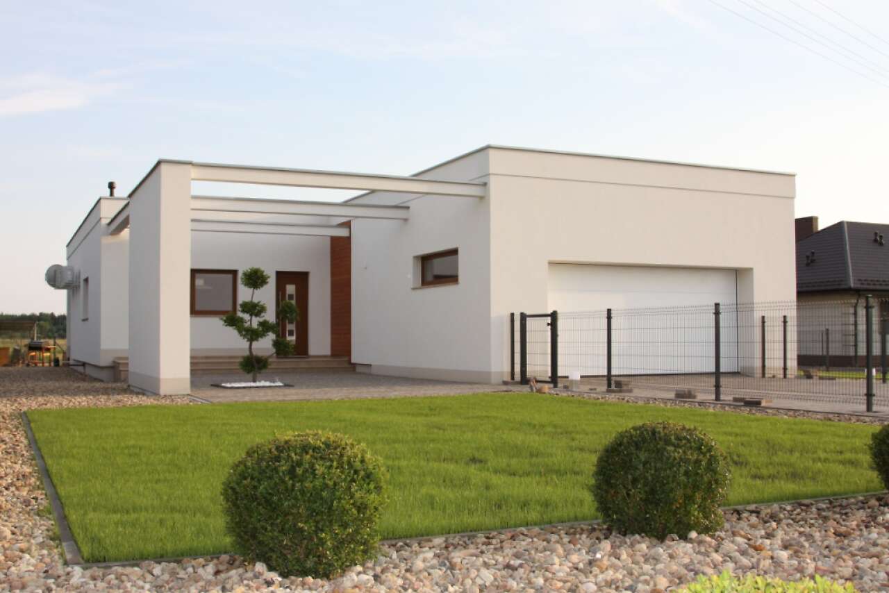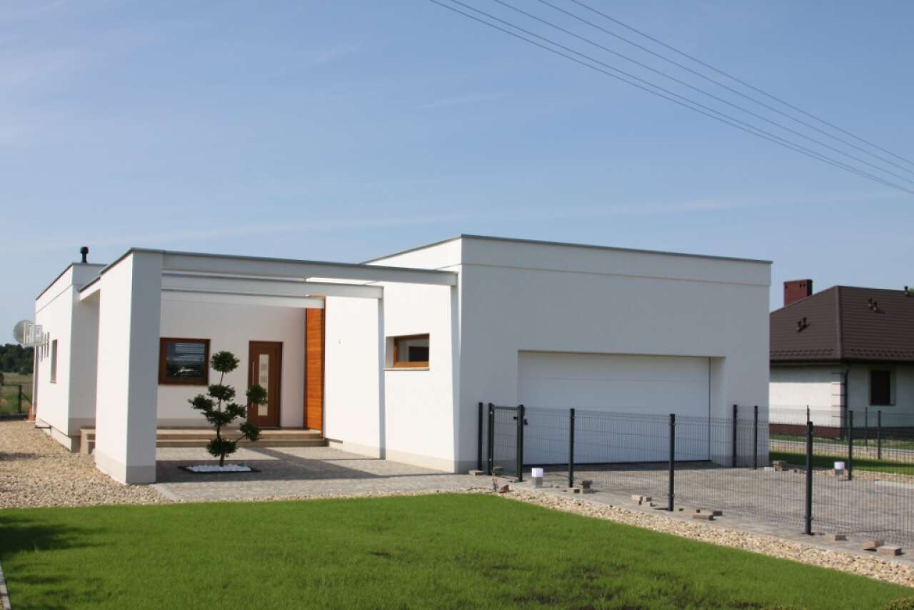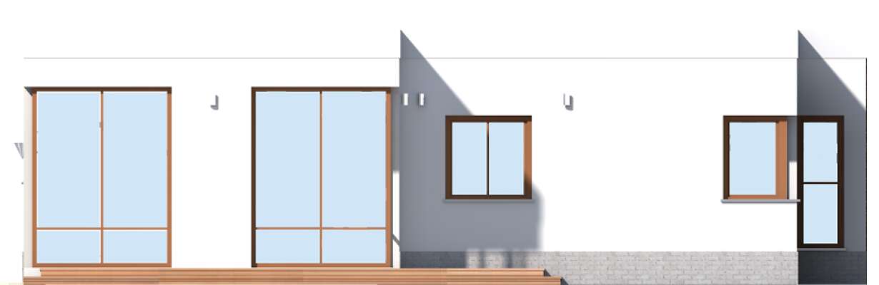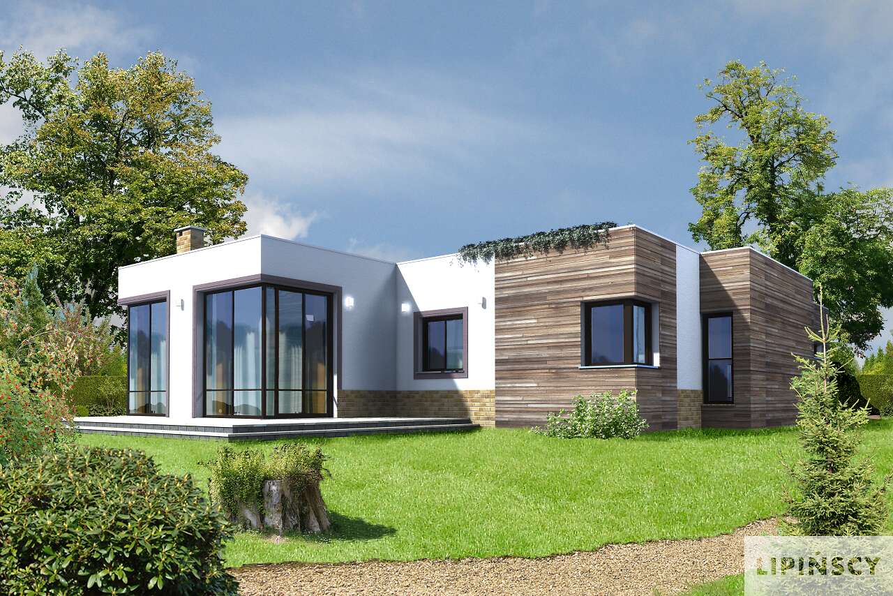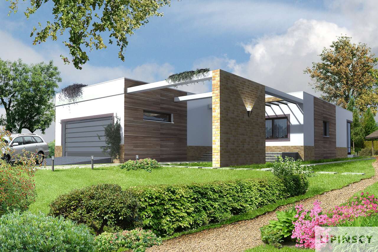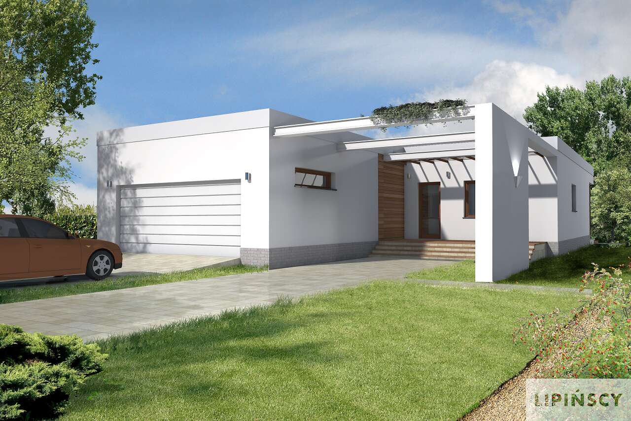 Jest to bardzo funkcjonalny, nowoczesny dom dla czteroosobowej rodziny. Charakteryzuje się płaskim dachem, a odważna architektura doskonale pasuje do nowych, miejskich i podmiejskich osiedli. We wnętrzu znajdziemy obszerny centralny hall, z którego szerokim przejściem można przedostać się do bardzo przestronnego i jasnego pokoju dziennego, do dużej kuchni z kącikiem jadalnym oraz do WC i pomieszczenia gospodarczego, połączonego z dwustanowiskowym garażem. Część nocną można łatwo oddzielić funkcjonalnie od części dziennej, znajdziemy tu trzy sypialnie i dużą, jasną łazienkę. Część gospodarcza jest niezależna od reszty domu, choć wygodnie z nią połączona.