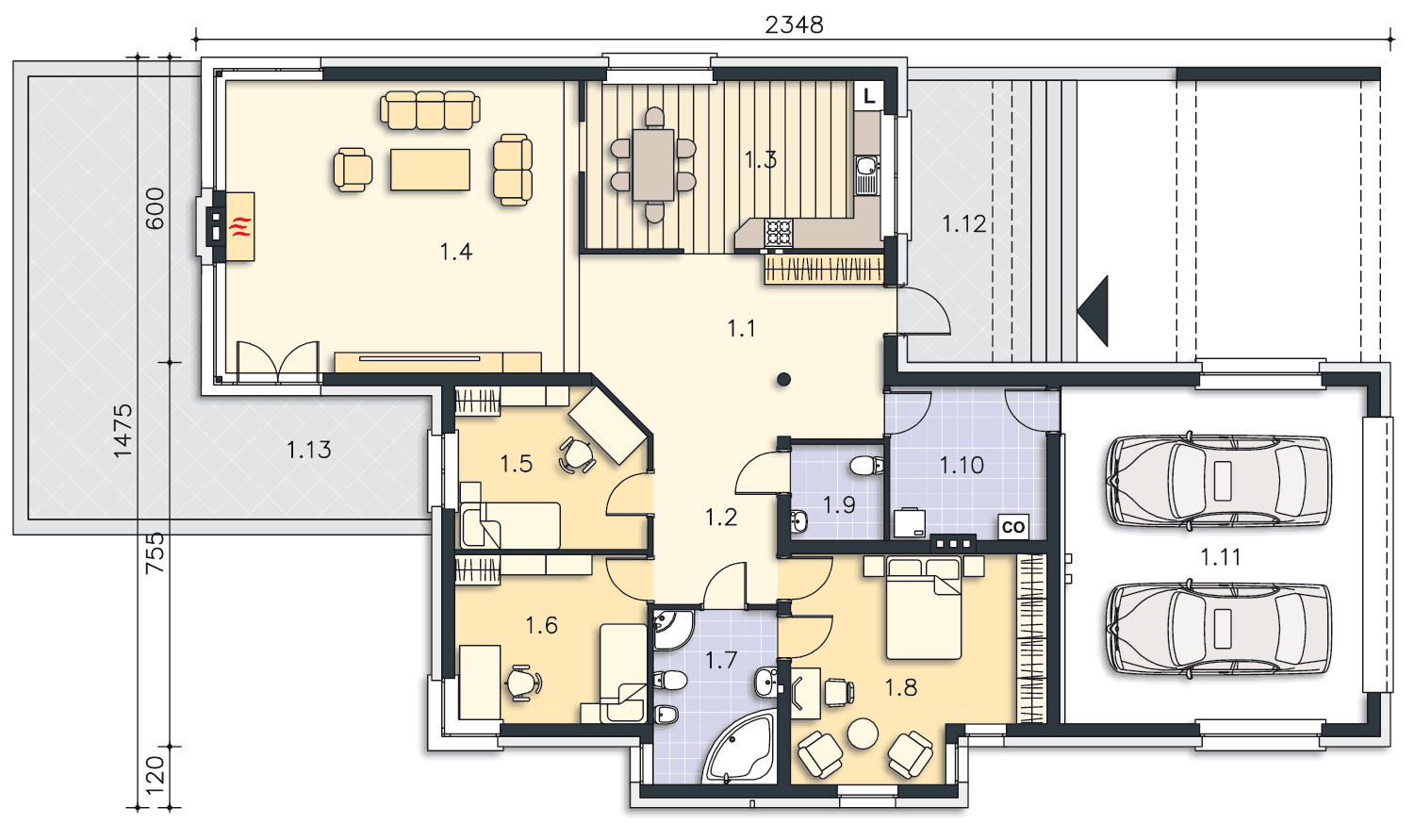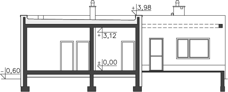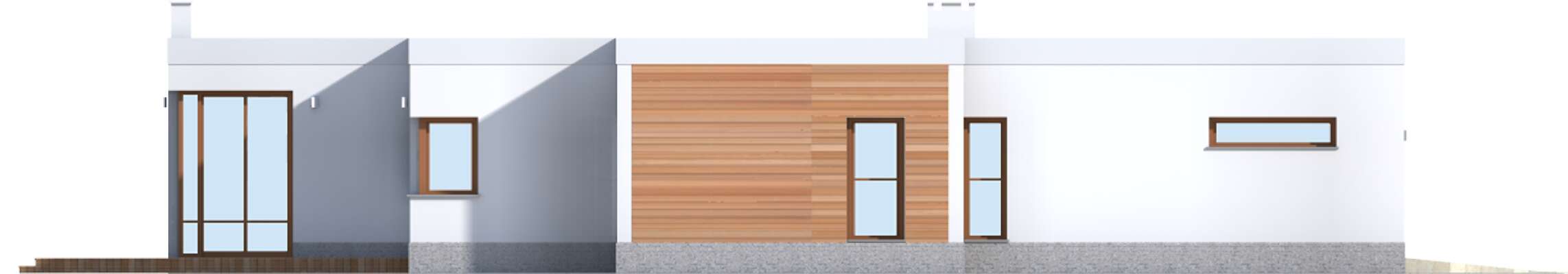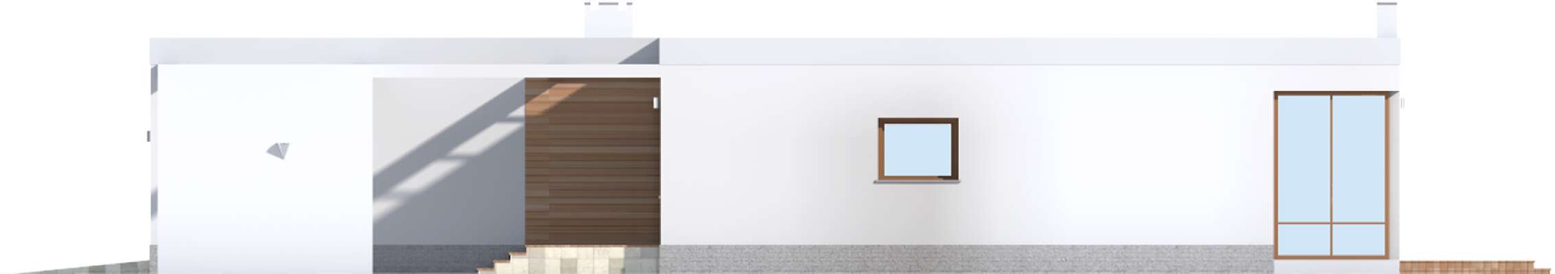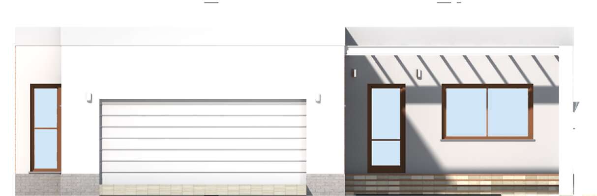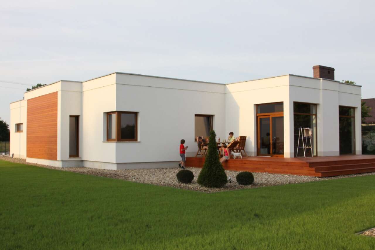 Jest to bardzo funkcjonalny, nowoczesny dom dla czteroosobowej rodziny. Charakteryzuje się płaskim dachem, a odważna architektura doskonale pasuje do nowych, miejskich i podmiejskich osiedli. We wnętrzu znajdziemy obszerny centralny hall, z którego szerokim przejściem można przedostać się do bardzo przestronnego i jasnego pokoju dziennego, do dużej kuchni z kącikiem jadalnym oraz do WC i pomieszczenia gospodarczego, połączonego z dwustanowiskowym garażem. Część nocną można łatwo oddzielić funkcjonalnie od części dziennej, znajdziemy tu trzy sypialnie i dużą, jasną łazienkę. Część gospodarcza jest niezależna od reszty domu, choć wygodnie z nią połączona.