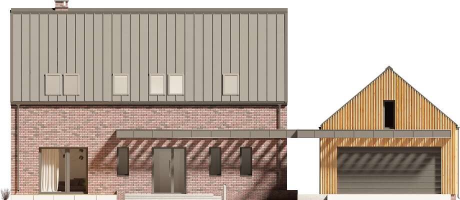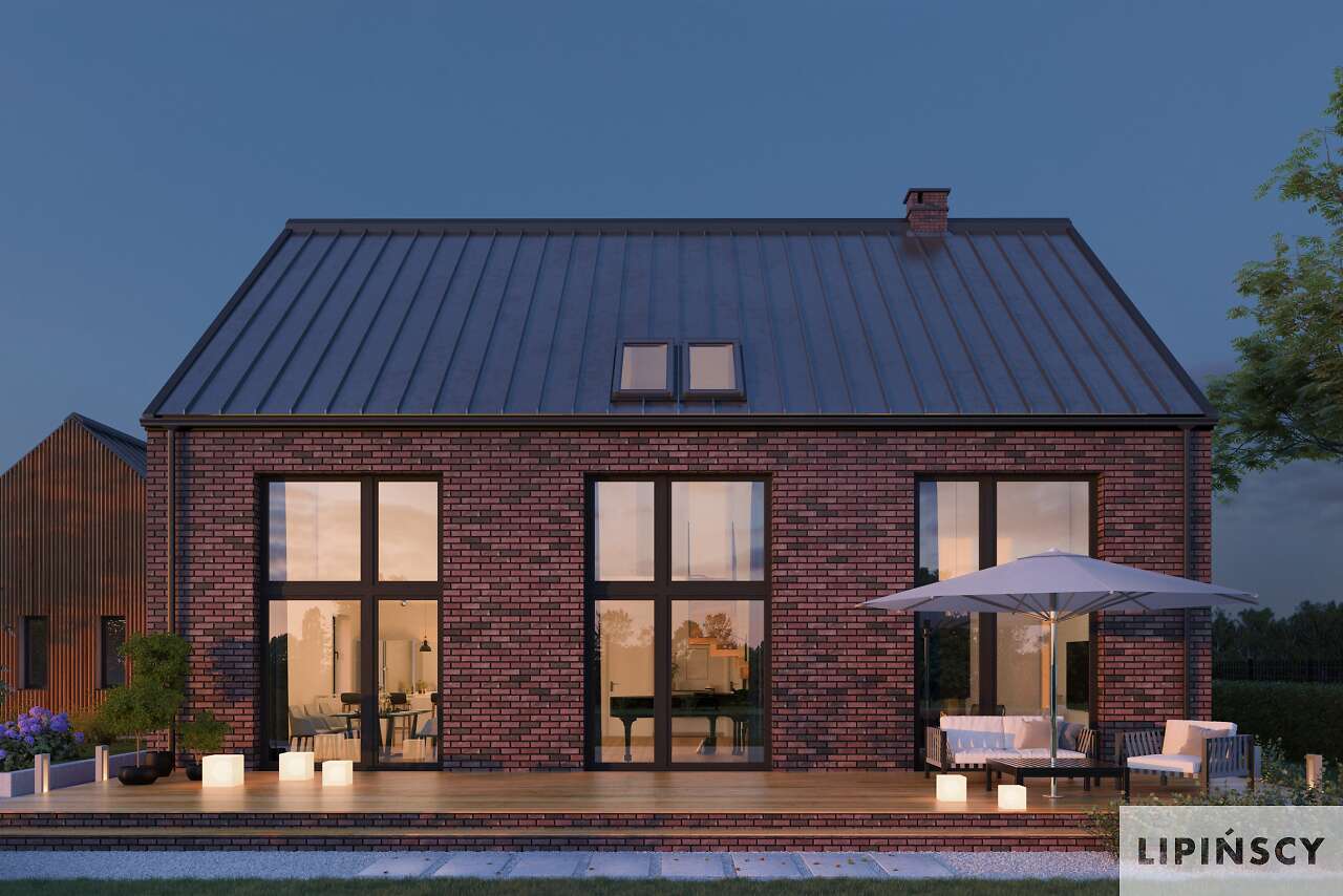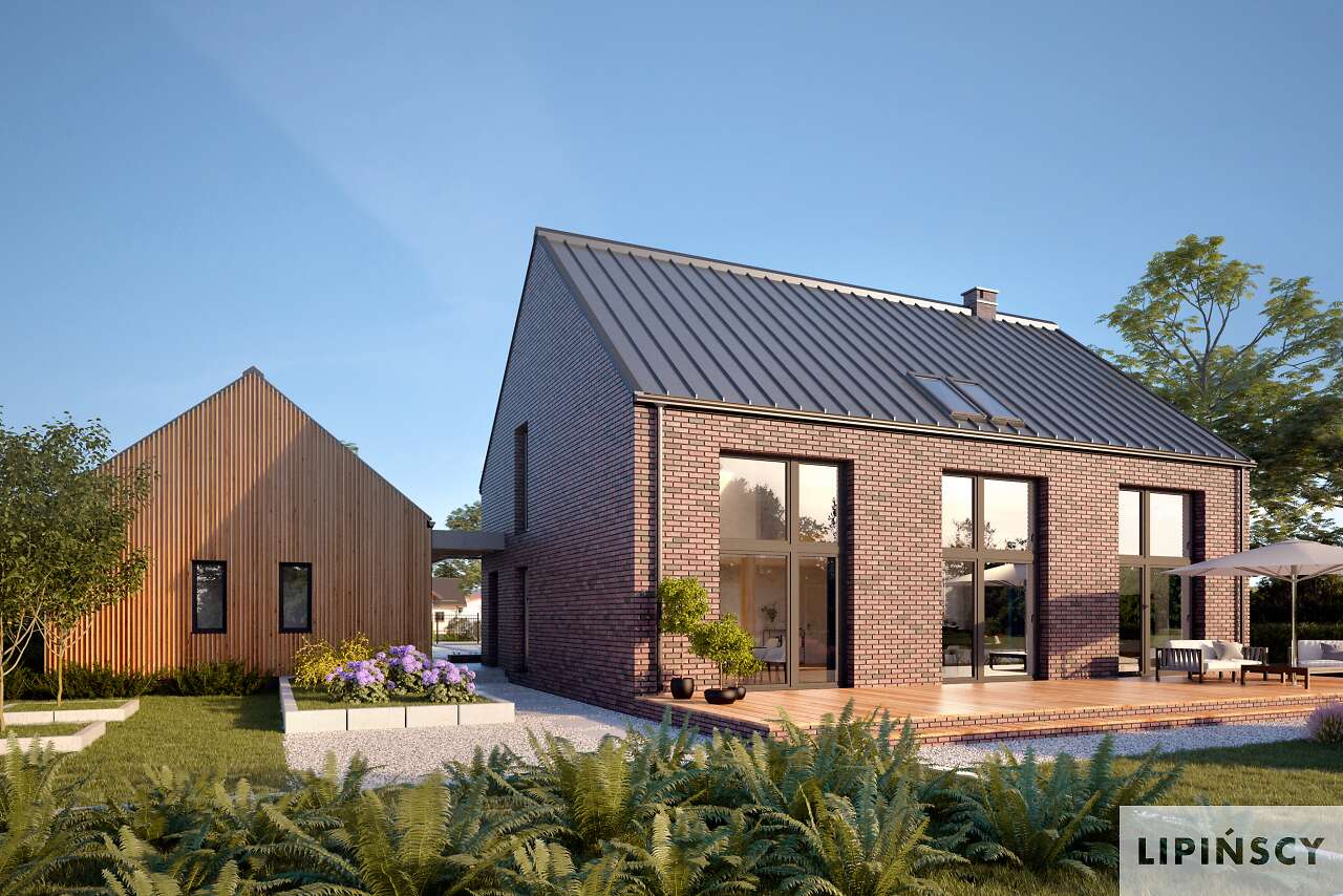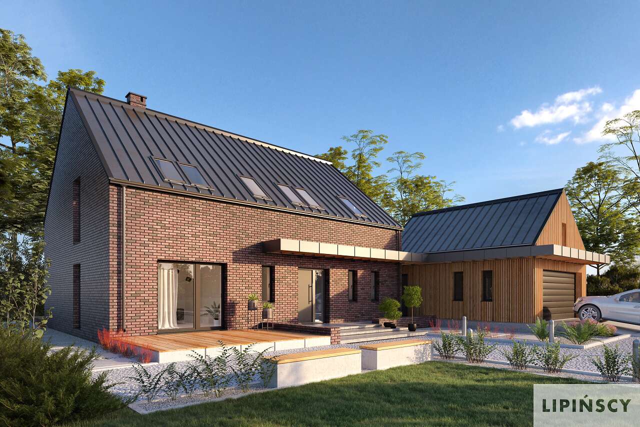 Projekt Lund to komfortowy dom niskoenergetyczny w stylu modnej „nowoczesnej stodoły”. Dwie bryły: domu i garażu zestawiono ze sobą tak, aby były wygodnie skomunikowane, co daje również możliwość ciekawego zaaranżowania terenu wokół budynków. Dom ma zapewnić wygodę użytkowania i poczucie przestrzeni, stąd mimo sporej powierzchni przeznaczony jest dla niewielkiej rodziny. Przestronność dodatkowo zapewnia antresola, która otwiera większość części dziennej aż po dach oraz w stronę ogrodu, umożliwiając zastosowanie okien wysokich niemal na dwie kondygnacje. Na antresoli znajdują się dwie sypialnie z łazienką i wc. Jest to więc propozycja dla osób ceniących wspólne spędzanie czasu i komfort dużych jasnych pomieszczeń. W projekcie przewidziano ogrzewanie pompą ciepła oraz rekuperację. Dostępna wersja bez garażu - Lund II DCP370a - zapytaj o projekt.