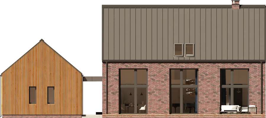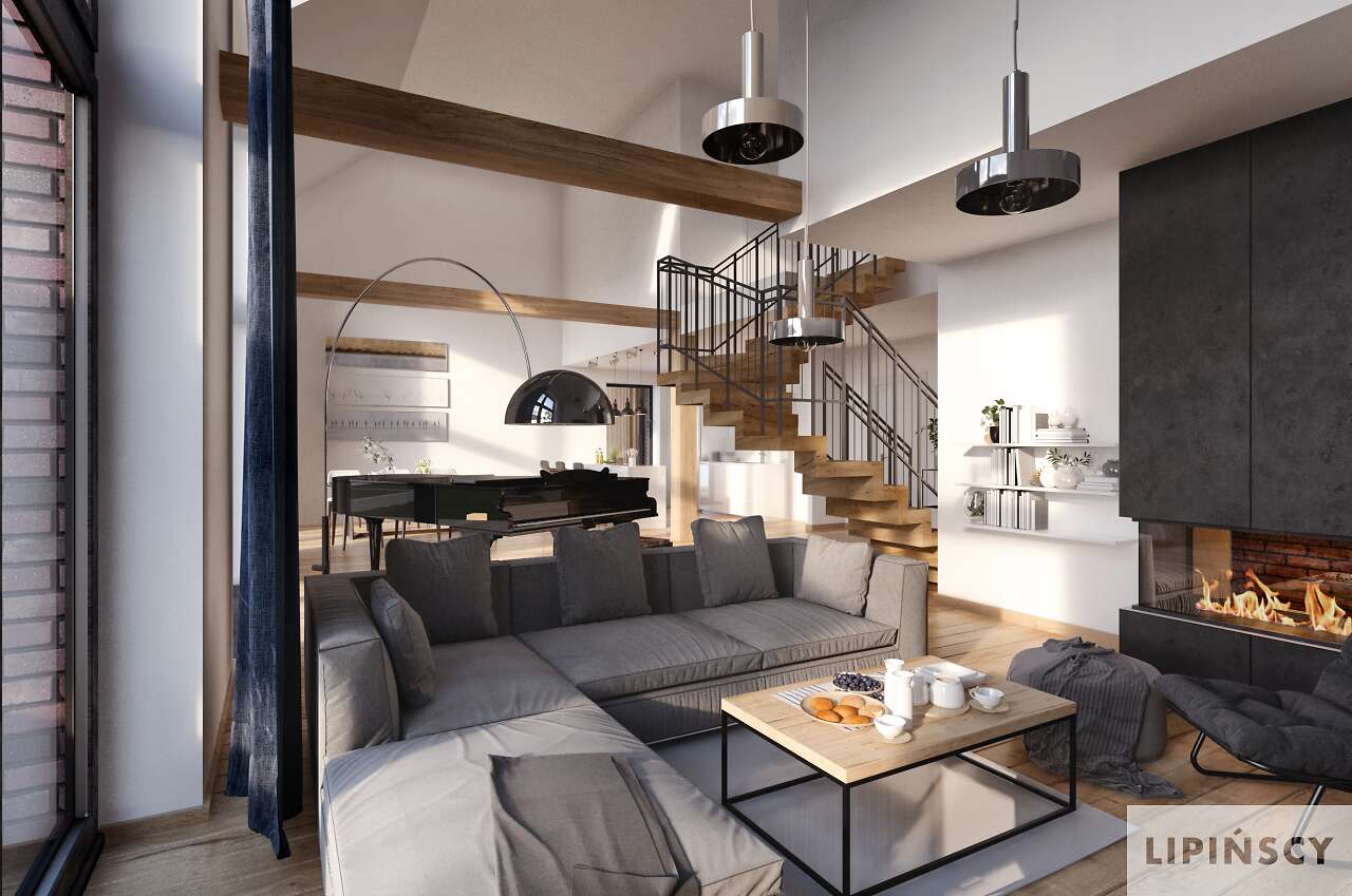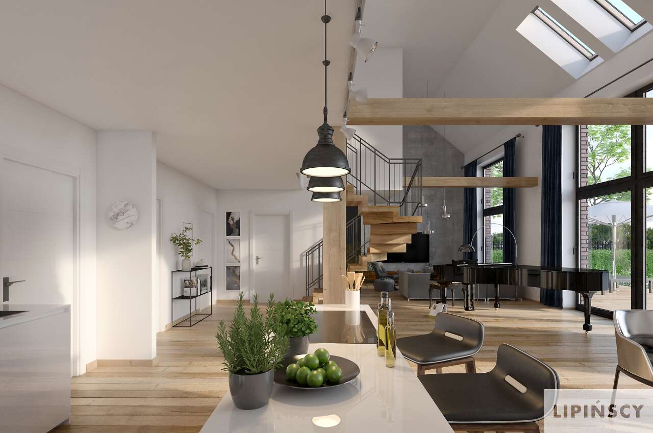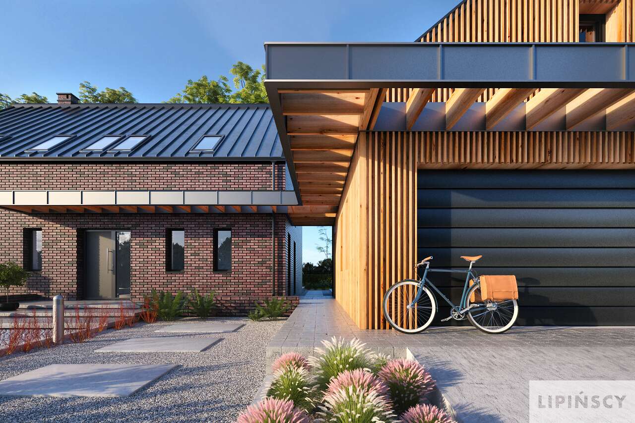 Projekt Lund to komfortowy dom niskoenergetyczny w stylu modnej „nowoczesnej stodoły”. Dwie bryły: domu i garażu zestawiono ze sobą tak, aby były wygodnie skomunikowane, co daje również możliwość ciekawego zaaranżowania terenu wokół budynków. Dom ma zapewnić wygodę użytkowania i poczucie przestrzeni, stąd mimo sporej powierzchni przeznaczony jest dla niewielkiej rodziny. Przestronność dodatkowo zapewnia antresola, która otwiera większość części dziennej aż po dach oraz w stronę ogrodu, umożliwiając zastosowanie okien wysokich niemal na dwie kondygnacje. Na antresoli znajdują się dwie sypialnie z łazienką i wc. Jest to więc propozycja dla osób ceniących wspólne spędzanie czasu i komfort dużych jasnych pomieszczeń. W projekcie przewidziano ogrzewanie pompą ciepła oraz rekuperację. Dostępna wersja bez garażu - Lund II DCP370a - zapytaj o projekt.