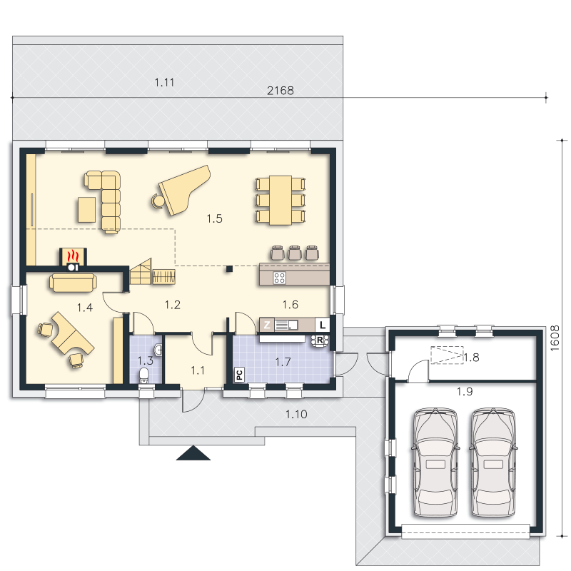 Nie posiadamy wersji projektu bez garażu, ale w ramach adaptacji można z niego zrezygnować. Sam dom ma 13,5 m szerokości więc minimalne wymiary działki zakładając, że musimy odsunąć się po 4 m po bokach, z przodu 5 m (ta odległość zależy jednak od zapisów w warunkach zabudowy), musiałaby mieć 21,5 m na 21 m.