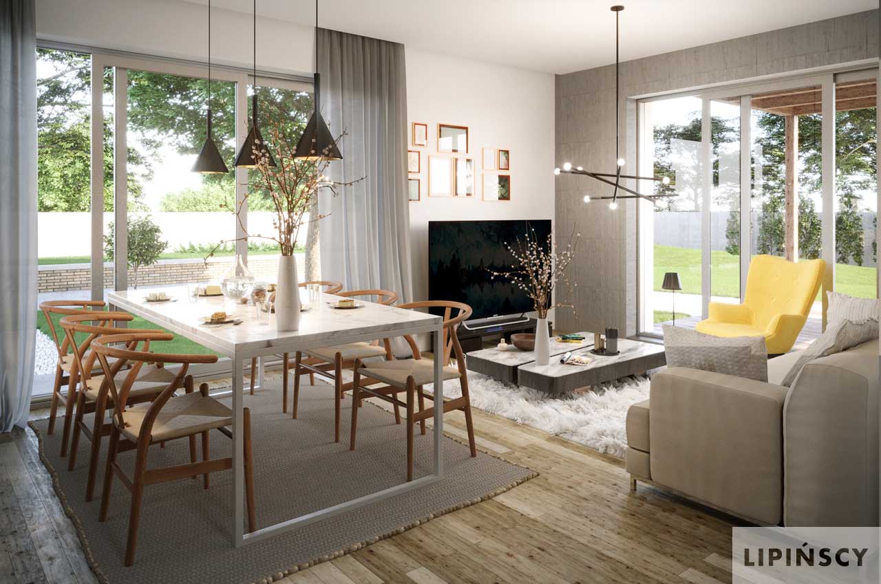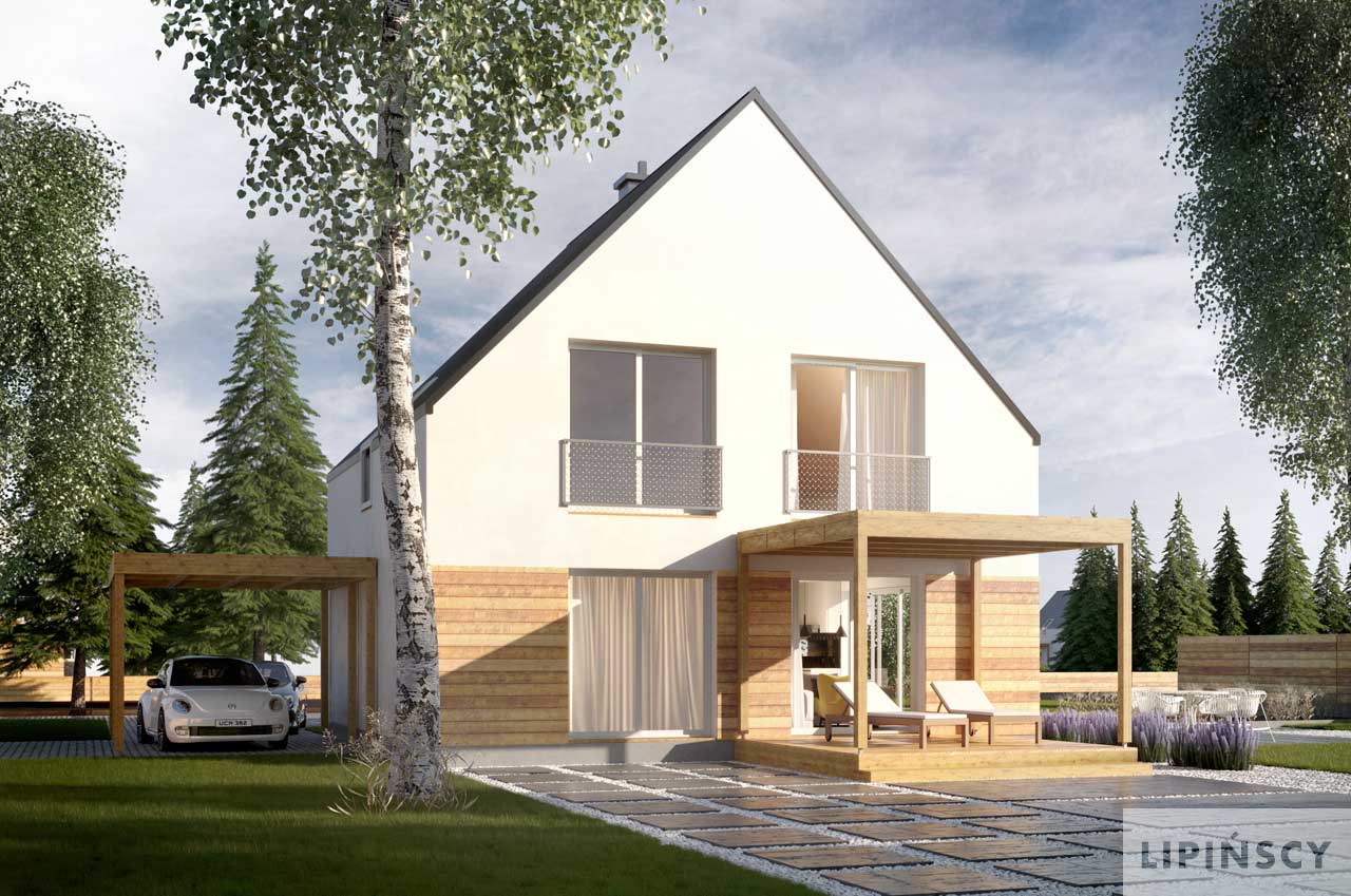 Nowoczesny, nieduży dom z poddaszem użytkowym o zdecydowanej zwartej bryle i dwuspadowym bez okapowym dachem. Parter to strefa dzienna z jadalnią i otwartą kuchnia za spiżarnią jest tu też łazienka z prysznicem i pokój, mogący być zależnie od potrzeb: sypialnią, pokojem gościnnym lub gabinetem. Na poddaszu natomiast są trzy przestronne sypialnie i duża łazienka. Wszystkie pomieszczenia są bardzo dobrze doświetlone, poprzez okna balkonowe a w kuchni jest narożnikowe okno umożliwiające oryginalna aranżacje tej przestrzeni. To dom dla miłośników nowoczesności i światła naturalnego. Dom będzie idealnie komponował się wśród zabudowy miejskiej jak również w założeniach wiejskich wśród natury. W projekcie przewidziano ogrzewanie kotłem na gaz. Możliwa jest zmiana ogrzewania na pompę ciepła.