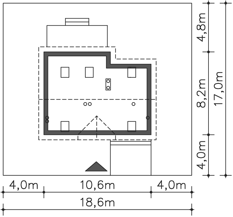 Grafika przedstawia minimalne wymiary działki. Aby sprawdzić, czy dom może być realizowany na konkretnej działce należy uzyskać Wypis i Wyrys z Miejscowego Planu Zagospodarowania Przestrzennego lub jeśli na danym terenie nie ma planu – Decyzję o warunkach zabudowy. Wszystkie projekty wymagają adaptacji do warunków miejscowych przez projektanta lokalnego.