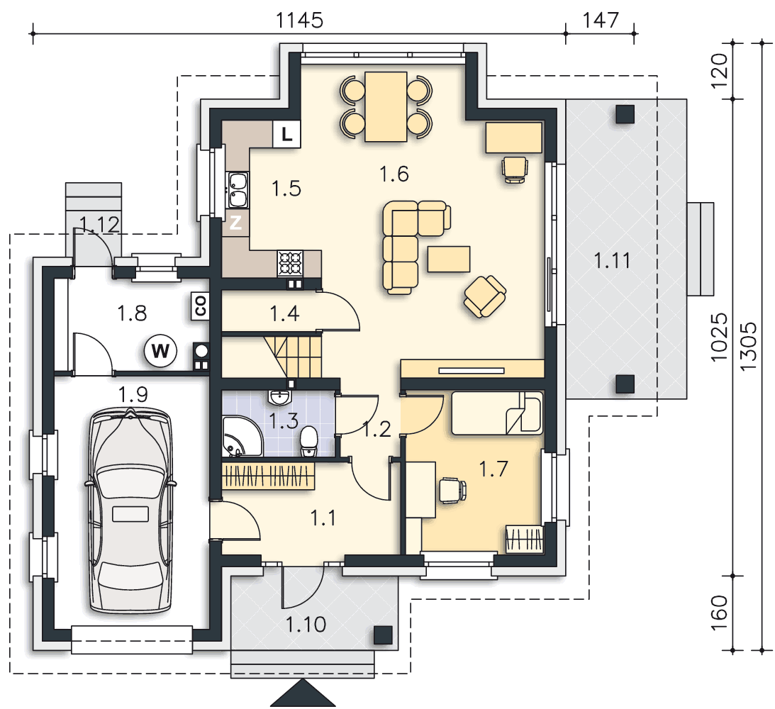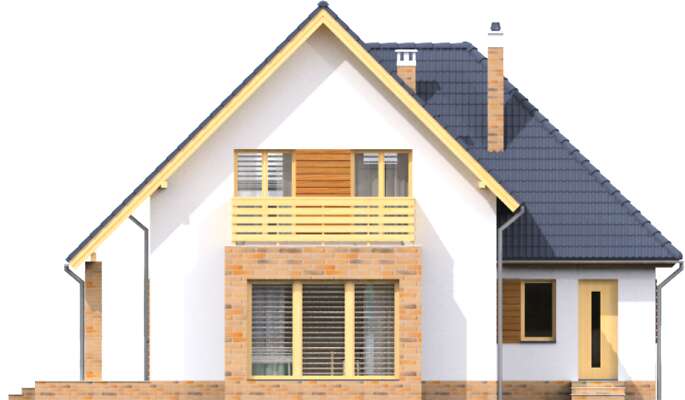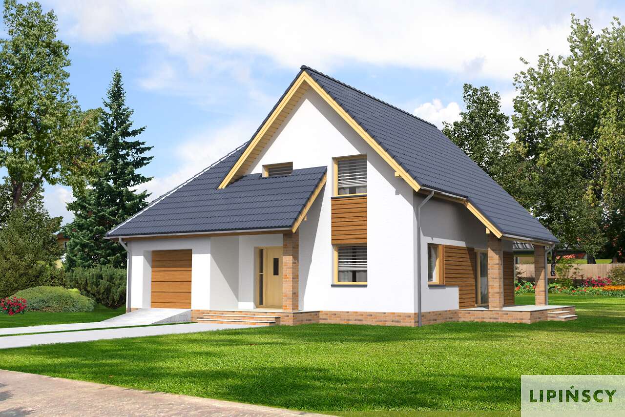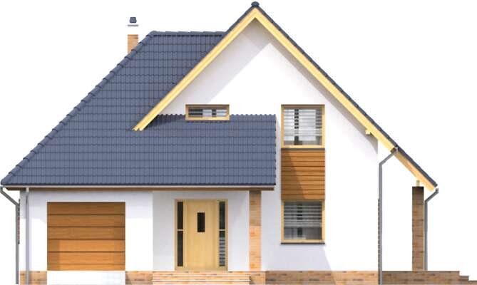 Klasyczny niewielki dom, w którym zmieścił się dodatkowy pokój na parterze. Dzięki usytuowaniu przy wejściu, może nadawać się na biuro, czy gabinet do pracy. Z wiatrołapu prowadzi bezpośrednie przejście do garażu, a następnie do kotłowni, w której można zastosować piec na paliwo stałe. Strefa dzienna to otwarta, wspólna przestrzeń salonu, jadalni i kuchni, z którą sąsiaduje mała spiżarnia pod schodami.