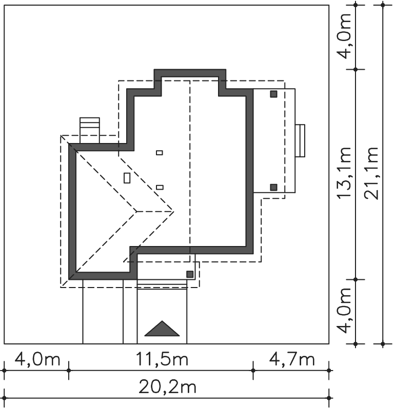 Grafika przedstawia minimalne wymiary działki. Aby sprawdzić, czy dom może być realizowany na konkretnej działce należy uzyskać Wypis i Wyrys z Miejscowego Planu Zagospodarowania Przestrzennego lub jeśli na danym terenie nie ma planu – Decyzję o warunkach zabudowy. Wszystkie projekty wymagają adaptacji do warunków miejscowych przez projektanta lokalnego.