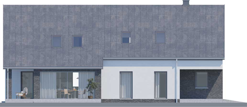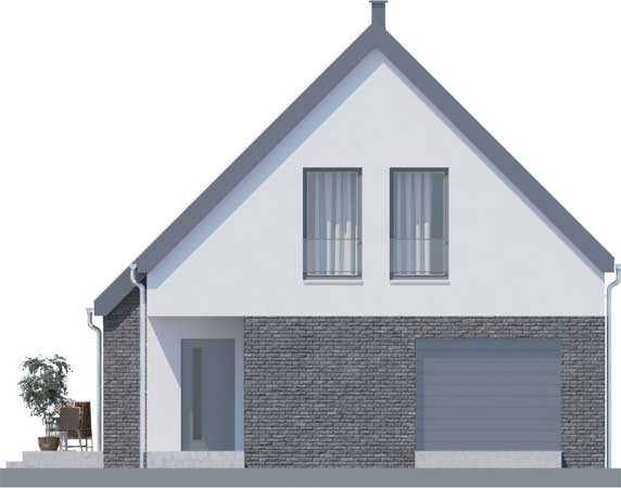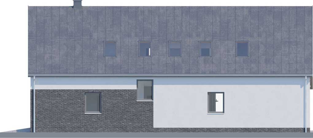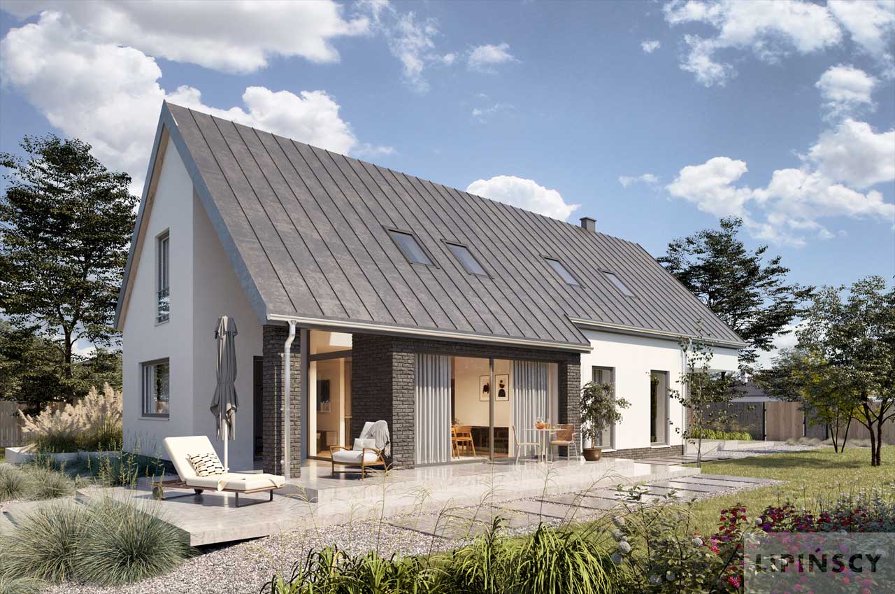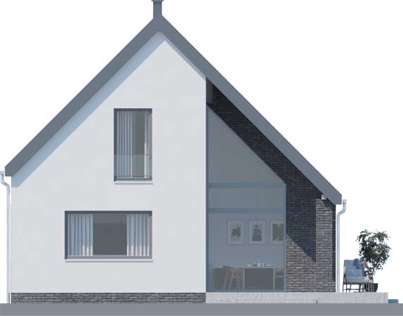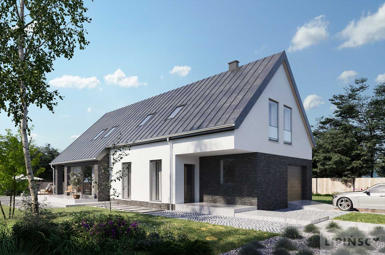 Nowoczesny dom z poddaszem użytkowym i dachem dwuspadowym. Mieszkańców i gości wita duży wiatrołap, w którym od razu można poczuć się jak w domu. Z wiatrołapu jest bezpośrednie przejście do części gospodarczej: jednostanowiskowego garażu i kotłowni. Wszystkich jednak zapraszamy do najpiękniejszej części domu, jaką stanowi przestronna część dzienna z wydzielonymi półotwartymi strefami: przytulnego salonu z wyjściem na taras; obszernej jadalni – wspaniale doświetlonej dzięki wysokim oknom i optycznie powiększonej poprzez antresolę; kuchni oddzielonej ścianką od salonu, ale otwartej na jadalnię. Jest to idealne miejsce do spożywania rodzinnych posiłków, jak i podejmowania gości na małych i większych przyjęciach. Dodatkowo na parterze znajduje się gabinet, który dobrze sprawdzi się również w roli pokoju gościnnego oraz łazienka. Na komfortowo rozplanowanym poddaszu mieści się strefa nocna domu, podzielona na dwie części. Jedna z nich to sypialnia małżeńska i mniejsza łazienka, zaś druga to dwie sypialnie, duża łazienka z miejscem zarówno na wannę, jak i kabinę prysznicową oraz pomieszczenie gospodarcze z funkcją pralni. W projekcie przewidziano ogrzewanie kotłem na gaz. Możliwa jest zmiana ogrzewania na pompę ciepła.