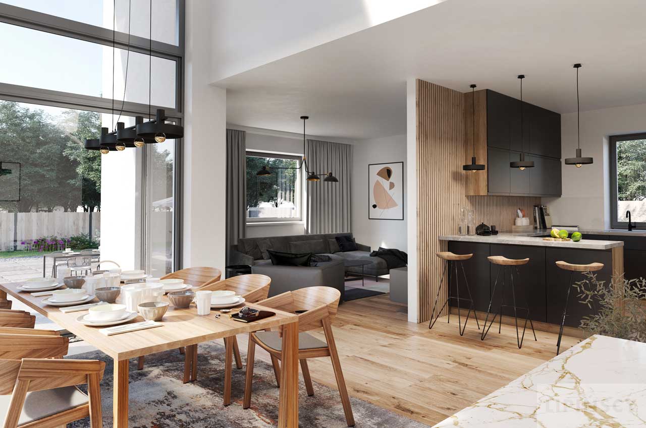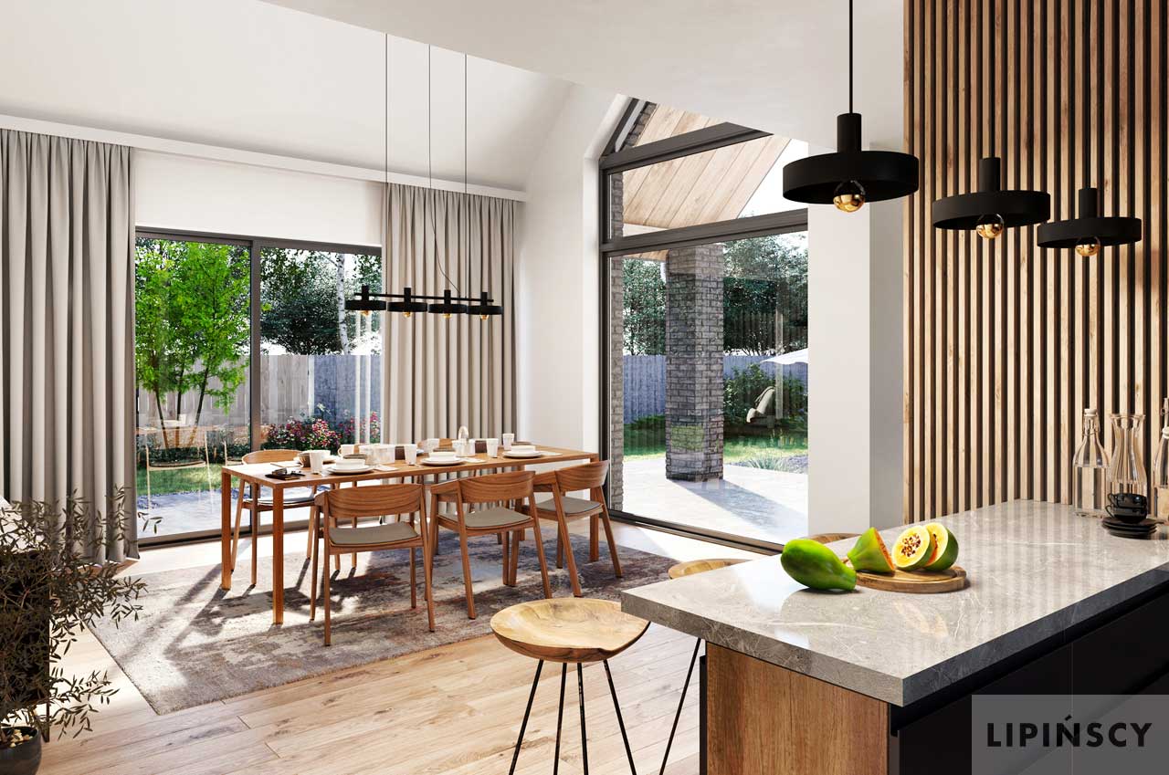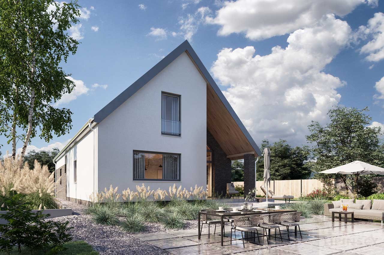 Nowoczesny dom z poddaszem użytkowym i dachem dwuspadowym. Mieszkańców i gości wita duży wiatrołap, w którym od razu można poczuć się jak w domu. Z wiatrołapu jest bezpośrednie przejście do części gospodarczej: jednostanowiskowego garażu i kotłowni. Wszystkich jednak zapraszamy do najpiękniejszej części domu, jaką stanowi przestronna część dzienna z wydzielonymi półotwartymi strefami: przytulnego salonu z wyjściem na taras; obszernej jadalni – wspaniale doświetlonej dzięki wysokim oknom i optycznie powiększonej poprzez antresolę; kuchni oddzielonej ścianką od salonu, ale otwartej na jadalnię. Jest to idealne miejsce do spożywania rodzinnych posiłków, jak i podejmowania gości na małych i większych przyjęciach. Dodatkowo na parterze znajduje się gabinet, który dobrze sprawdzi się również w roli pokoju gościnnego oraz łazienka. Na komfortowo rozplanowanym poddaszu mieści się strefa nocna domu, podzielona na dwie części. Jedna z nich to sypialnia małżeńska i mniejsza łazienka, zaś druga to dwie sypialnie, duża łazienka z miejscem zarówno na wannę, jak i kabinę prysznicową oraz pomieszczenie gospodarcze z funkcją pralni. W projekcie przewidziano ogrzewanie kotłem na gaz. Możliwa jest zmiana ogrzewania na pompę ciepła.