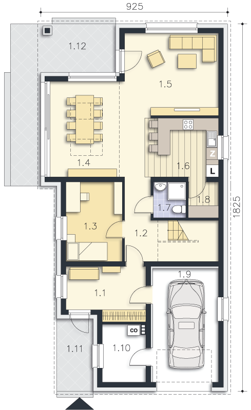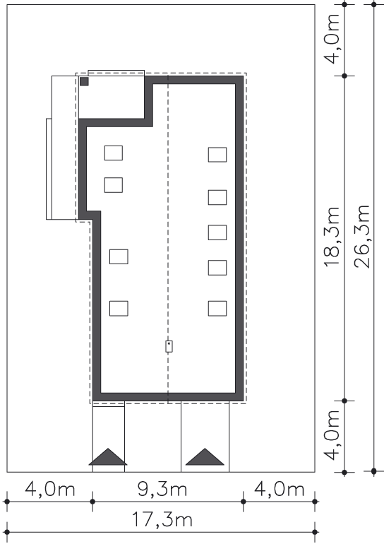 Grafika przedstawia minimalne wymiary działki. Aby sprawdzić, czy dom może być realizowany na konkretnej działce należy uzyskać Wypis i Wyrys z Miejscowego Planu Zagospodarowania Przestrzennego lub jeśli na danym terenie nie ma planu – Decyzję o warunkach zabudowy. Wszystkie projekty wymagają adaptacji do warunków miejscowych przez projektanta lokalnego.