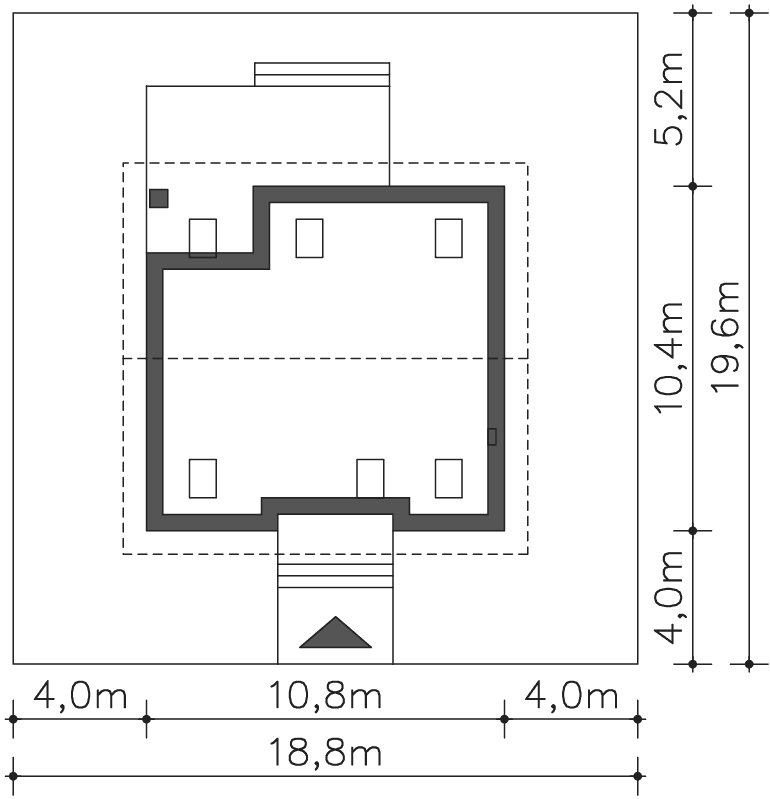 Grafika przedstawia minimalne wymiary działki. Aby sprawdzić, czy dom może być realizowany na konkretnej działce należy uzyskać Wypis i Wyrys z Miejscowego Planu Zagospodarowania Przestrzennego lub jeśli na danym terenie nie ma planu – Decyzję o warunkach zabudowy. Wszystkie projekty wymagają adaptacji do warunków miejscowych przez projektanta lokalnego.