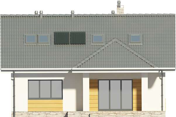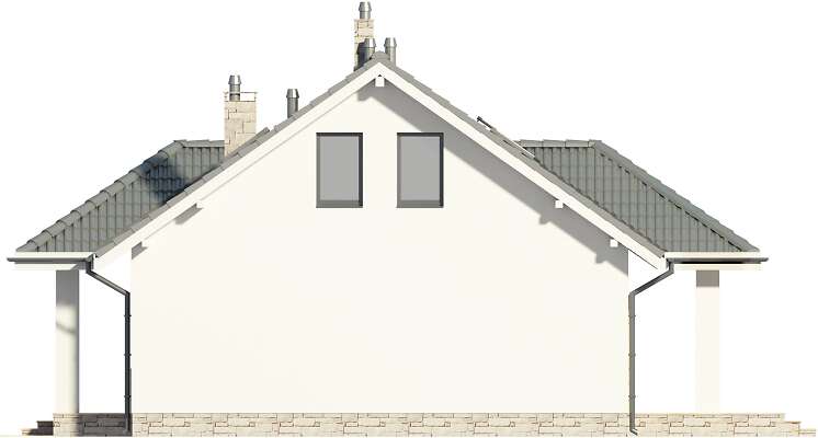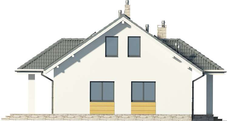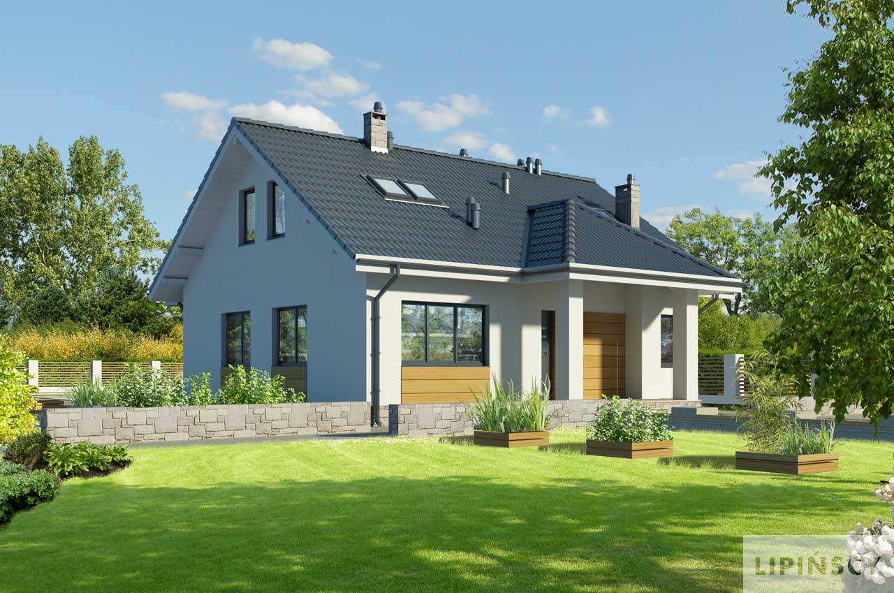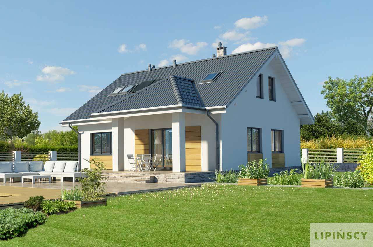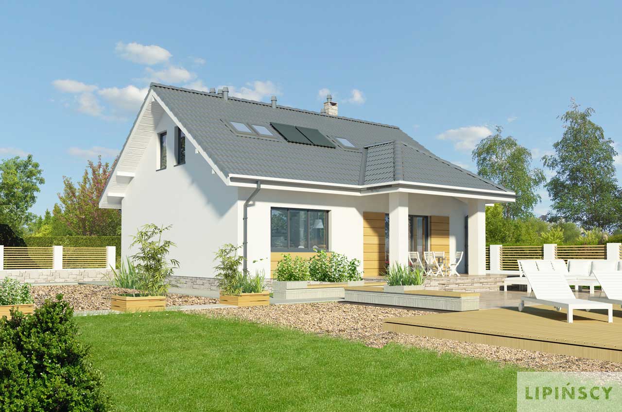 Niewielki, funkcjonalnie rozplanowany dom, przekryty prostym, dwuspadowym dachem. Parter to część dzienna – otwarta na salon kuchnia, salon z centralnie zlokalizowanym kominkiem i aneksem jadalnym, z którego jest wyjście na zadaszony taras oraz łazienka i pomieszczenie gospodarcze. Dodatkowy pokój może służyć jako sypialnia dla gości. W części nocnej - na poddaszu, zaplanowano dwie sypialnie, dużą łazienkę i dwie podręczne garderoby.