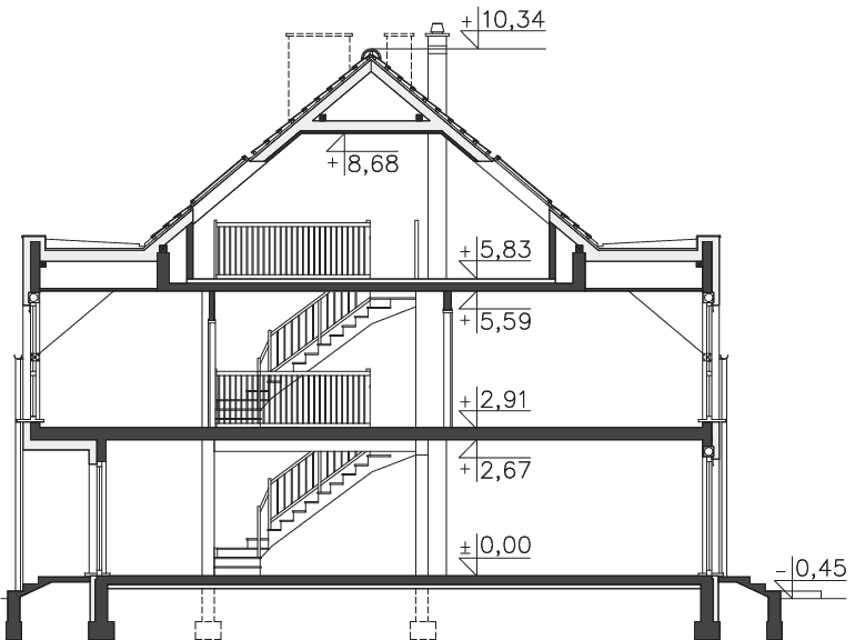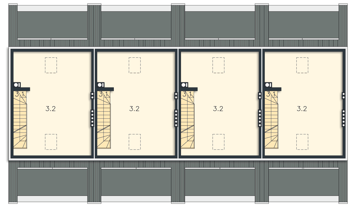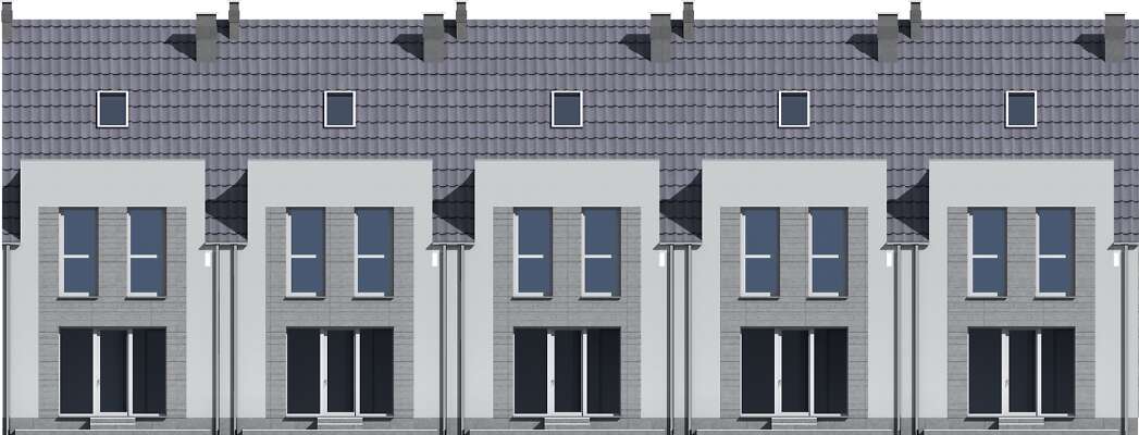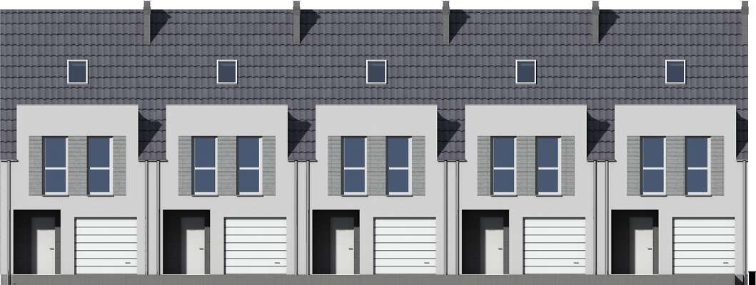 Projekt wąskiego domu do zabudowy szeregowej z dużym poddaszem oraz studiem na trzeciej kondygnacji. Szerokie lukarny na poddaszu powiększaja przestrzeń użytkową, także do dyspozycji jest niemal pełna kondygnacja z trzema sypialniami i dużą łazienką. Na parterze znajduje się salon z aneksem kuchennym, wc z piecem c.o. oraz garaż. Przestrzeń na trzeciej kondygnacji można dowolnie zagospodarować, bo do dyspozycji jest prawie 30 m kw. Projekt przewiduje dużą powierzchnię szaf w zabudowie.
