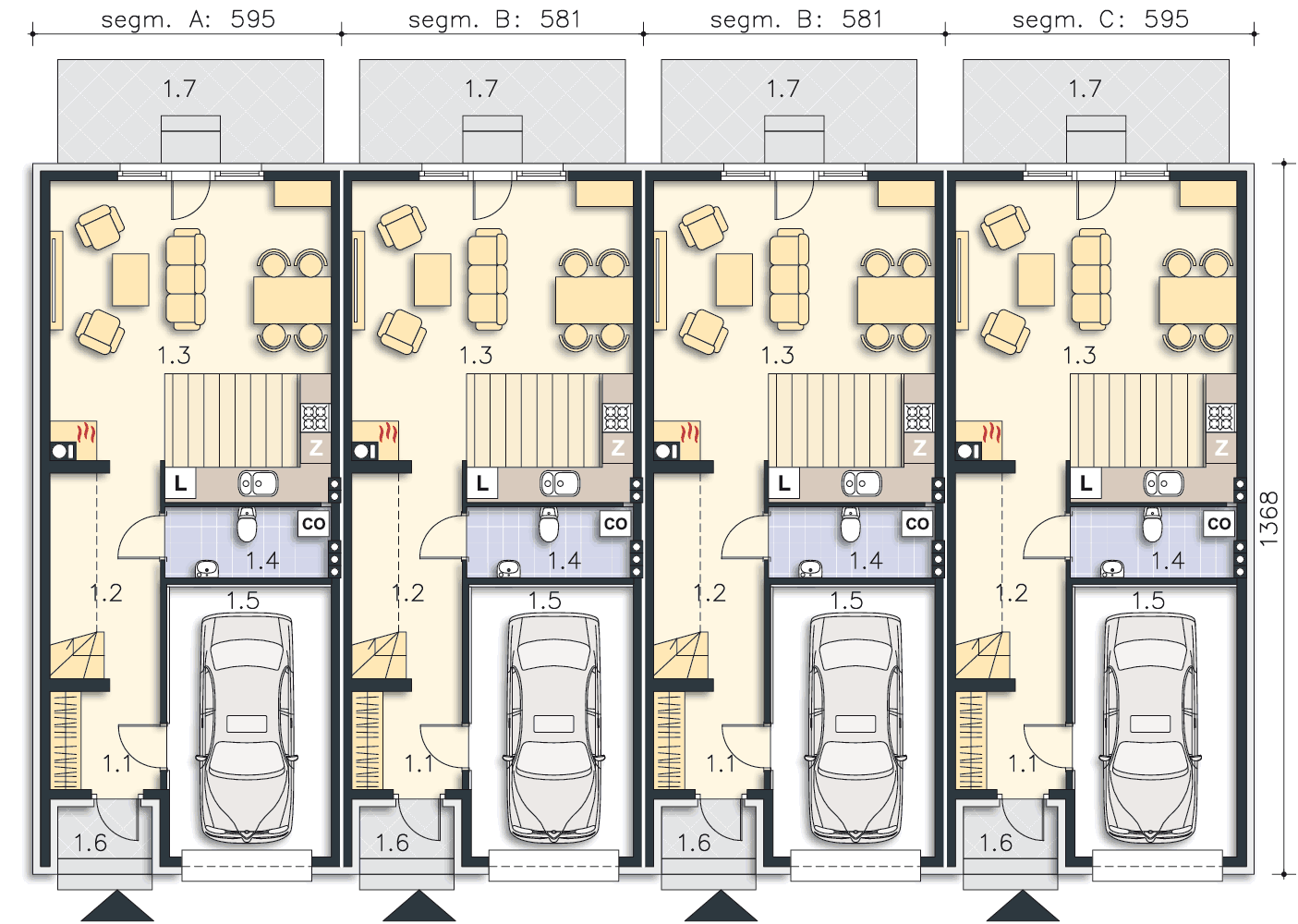 Można zrealizować jeden segment jako dom wolnostojący. Teoretycznie wystarczy do tego działka o szer. 9 m. Ale zalezy to również od warunków zabudowy.