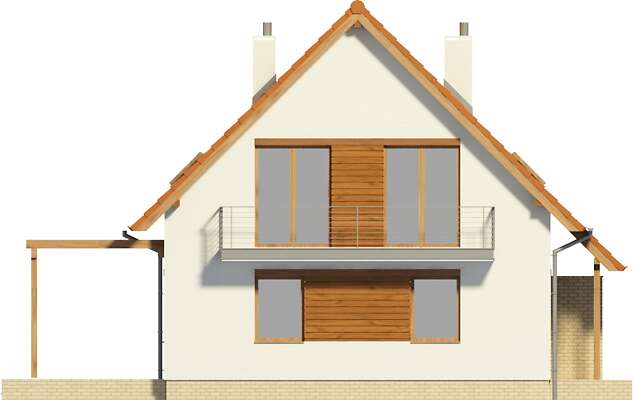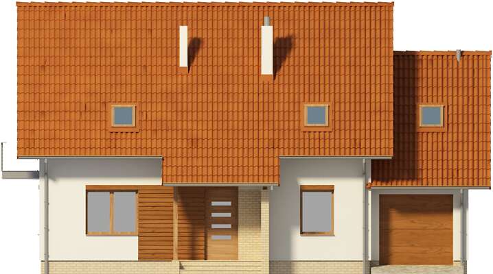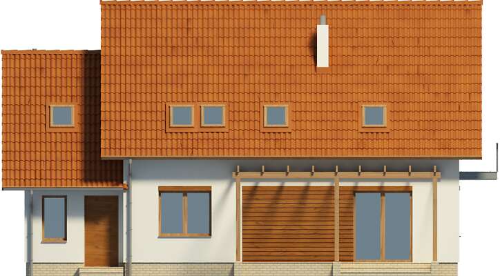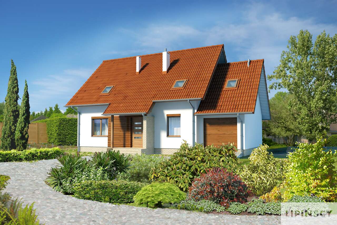Tani w realizacji, wygodny dom z użytkowym poddaszem. Wersja z garażem projektu Miluza o prostej bryle urozmaiconej ciekawymi elementami: wkomponowanymi w elewację elementami drewnianymi, metalową balustradą balkonową i pergolą od strony ogrodowej. Otwarty na salon hall daje wrażenie większej przestrzeni. Zamknięta kuchnia to wyłączne królestwo pani domu. Na parterze zaplanowano także pokój, będący w zależności od potrzeb dodatkową sypialnią lub gabinetem oraz łazienkę. Poddasze to trzy ustawne sypialnie, dwie garderoby oraz wygodna łazienka połączona z pralnią i suszarnią.