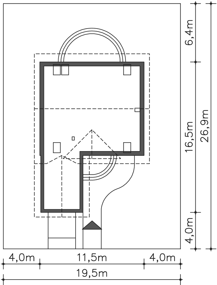 Grafika przedstawia minimalne wymiary działki. Aby sprawdzić, czy dom może być realizowany na konkretnej działce należy uzyskać Wypis i Wyrys z Miejscowego Planu Zagospodarowania Przestrzennego lub jeśli na danym terenie nie ma planu – Decyzję o warunkach zabudowy. Wszystkie projekty wymagają adaptacji do warunków miejscowych przez projektanta lokalnego.
