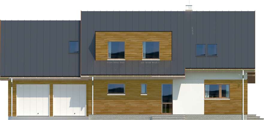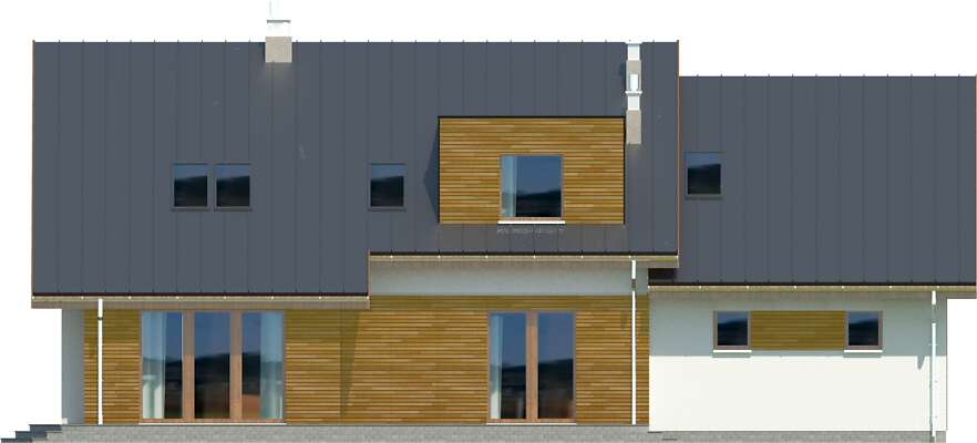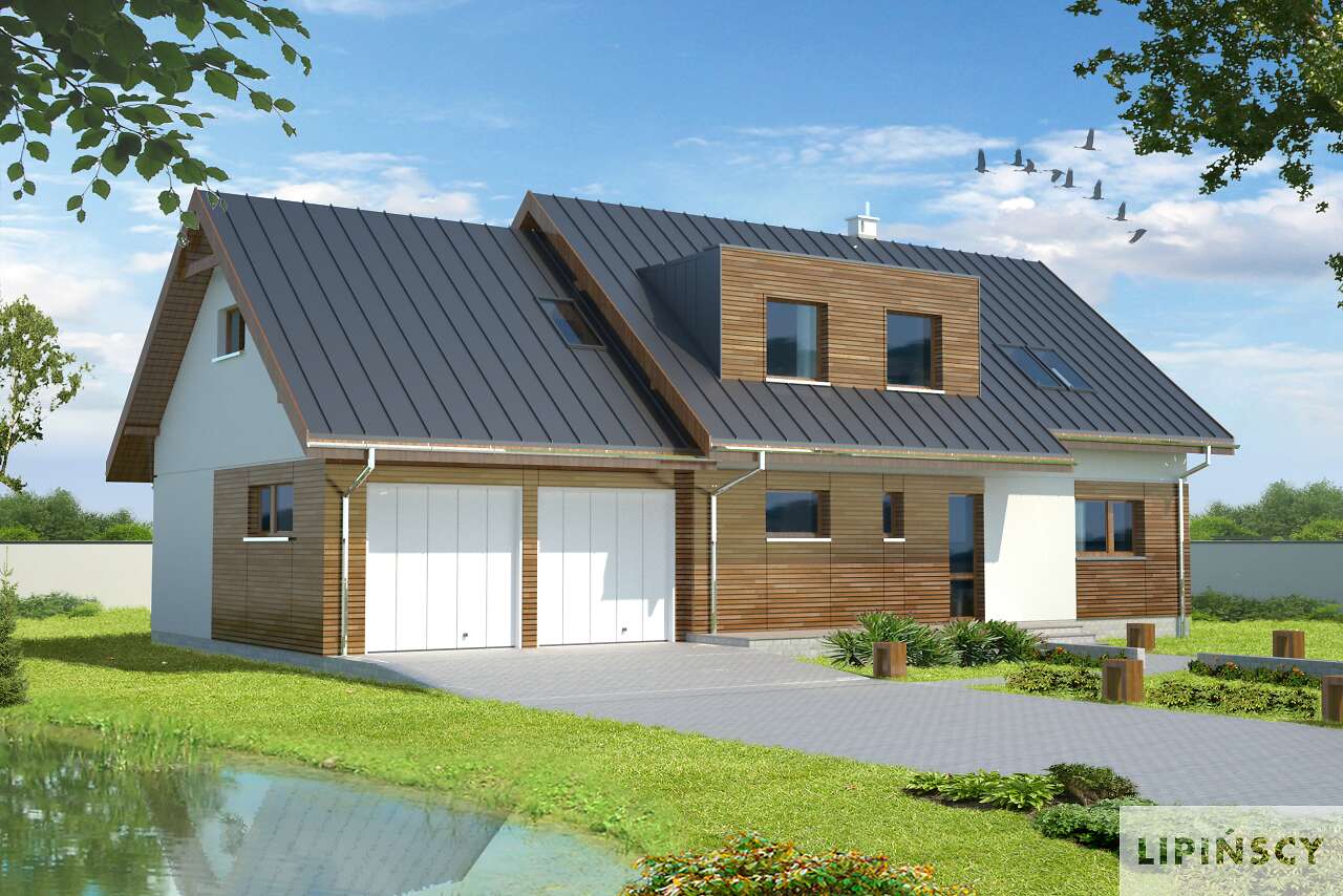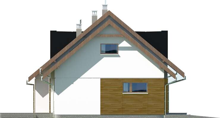 Wygodny, energooszczędny dom z użytkowym poddaszem, połączenie funkcjonalności z nowoczesnym wyglądem. Do wnętrza zaprasza obszerny wiatrołap, prowadzący do połączonego z kuchnią salonu. Jego ozdobą jest centralnie zlokalizowany kominek. Obok kuchni przewidziano spiżarnię, jest tu także dodatkowy pokój, łazienka i pomieszczenie gospodarcze, z którego można przejść do garażu. W dwustanowiskowym garażu wydzielono kotłownię z niezależnym wyjściem na zewnątrz. Poddasze zajmują trzy sypialne, w tym jedna z własną łazienką, garderobą i pomieszczeniem gospodarczym, które można przeznaczyć na pracownię. Zaprojektowane na dachu prostokątne lukarny pełnią nie tylko funkcję ozdobną, ale przede wszystkim zwiększają powierzchnię na poddaszu.