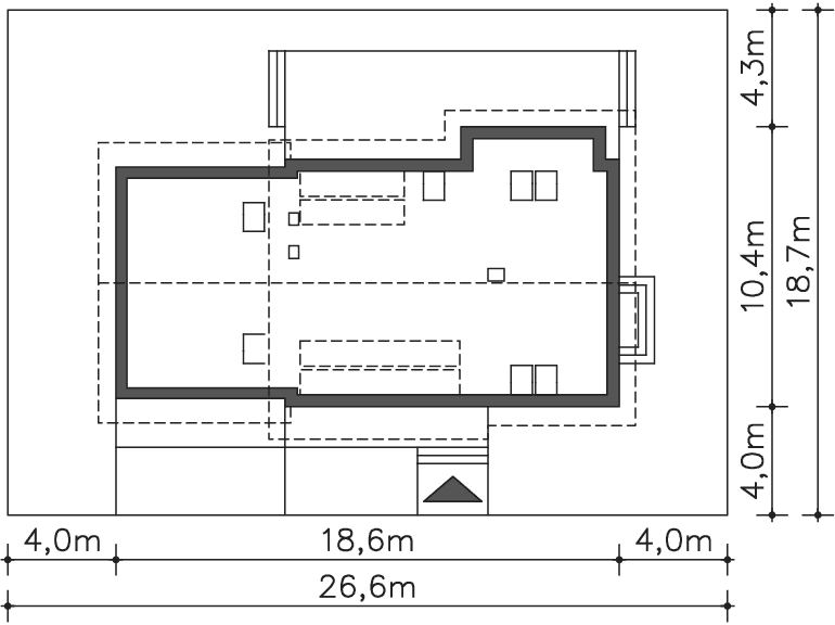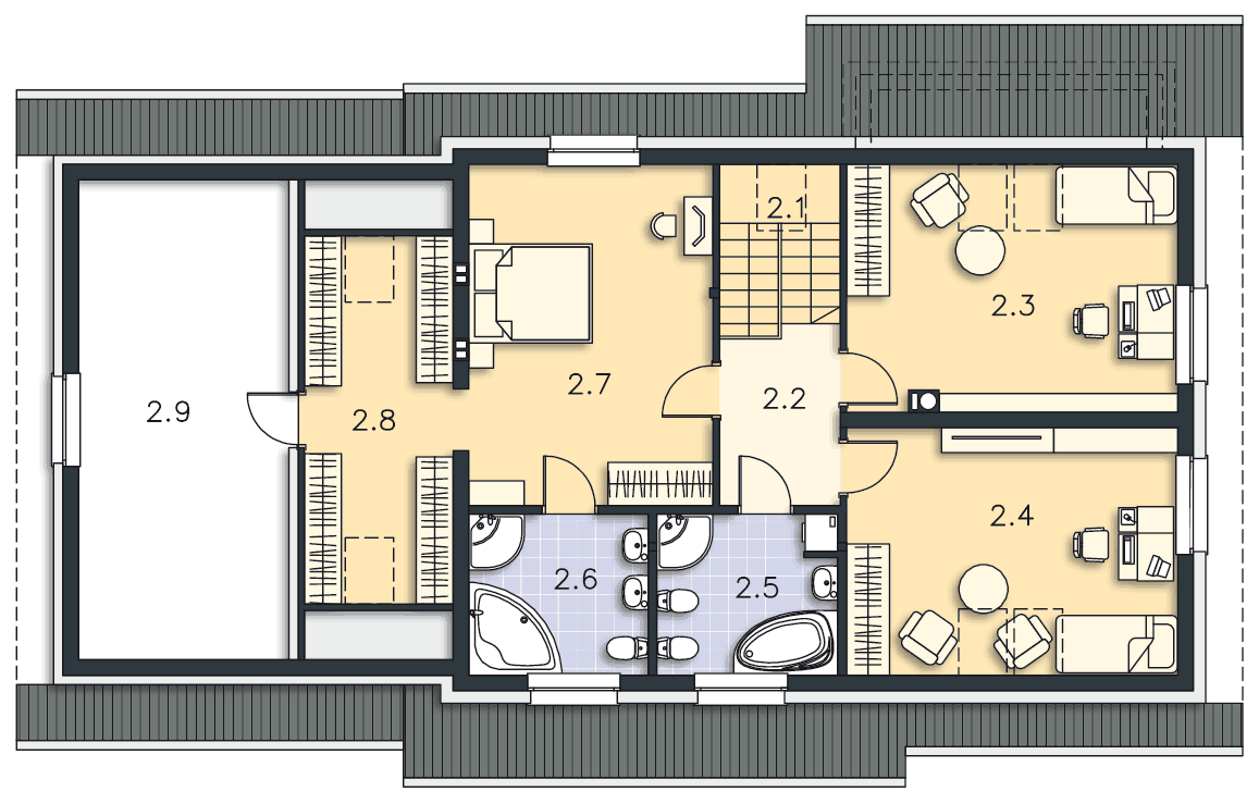 Ten projekt spełnia założenia planu zagospodarowania - połacie są symetryczne. Zapis mówi o tym, aby połać dachu np: nad łazienkami nie była niżej/wyżej od połaci nad pokojami 2.7 i 2.3.