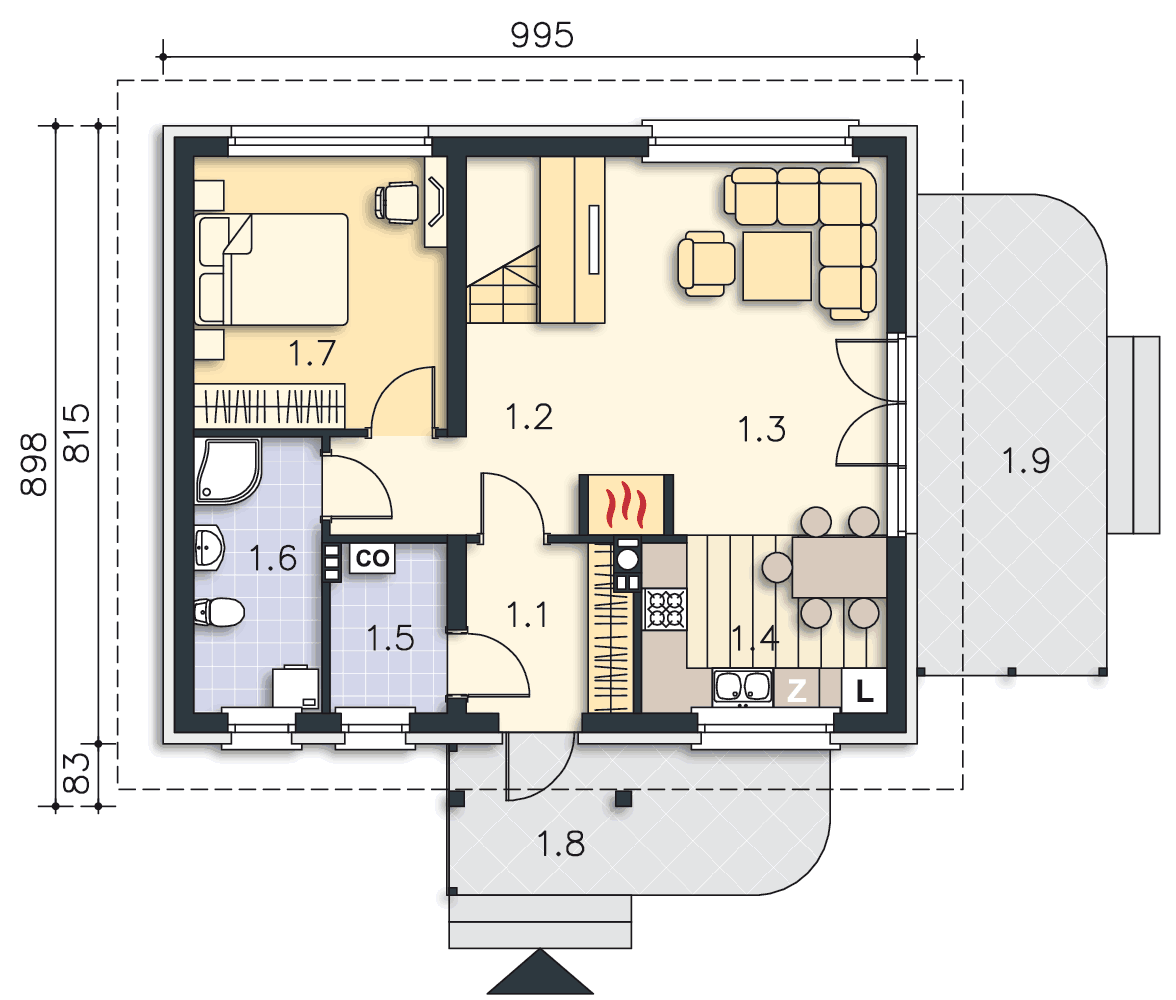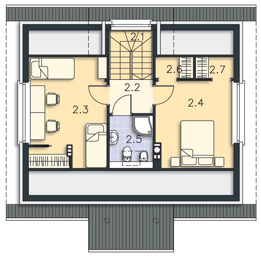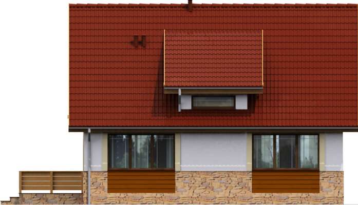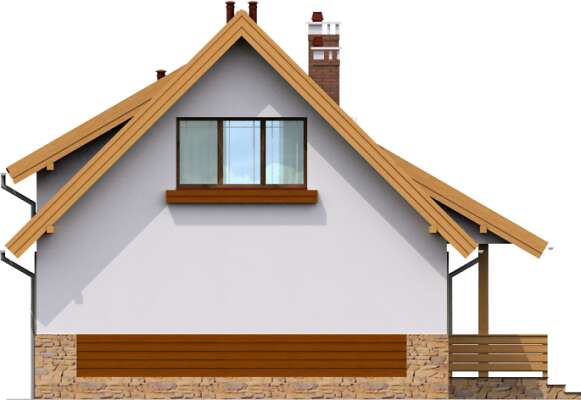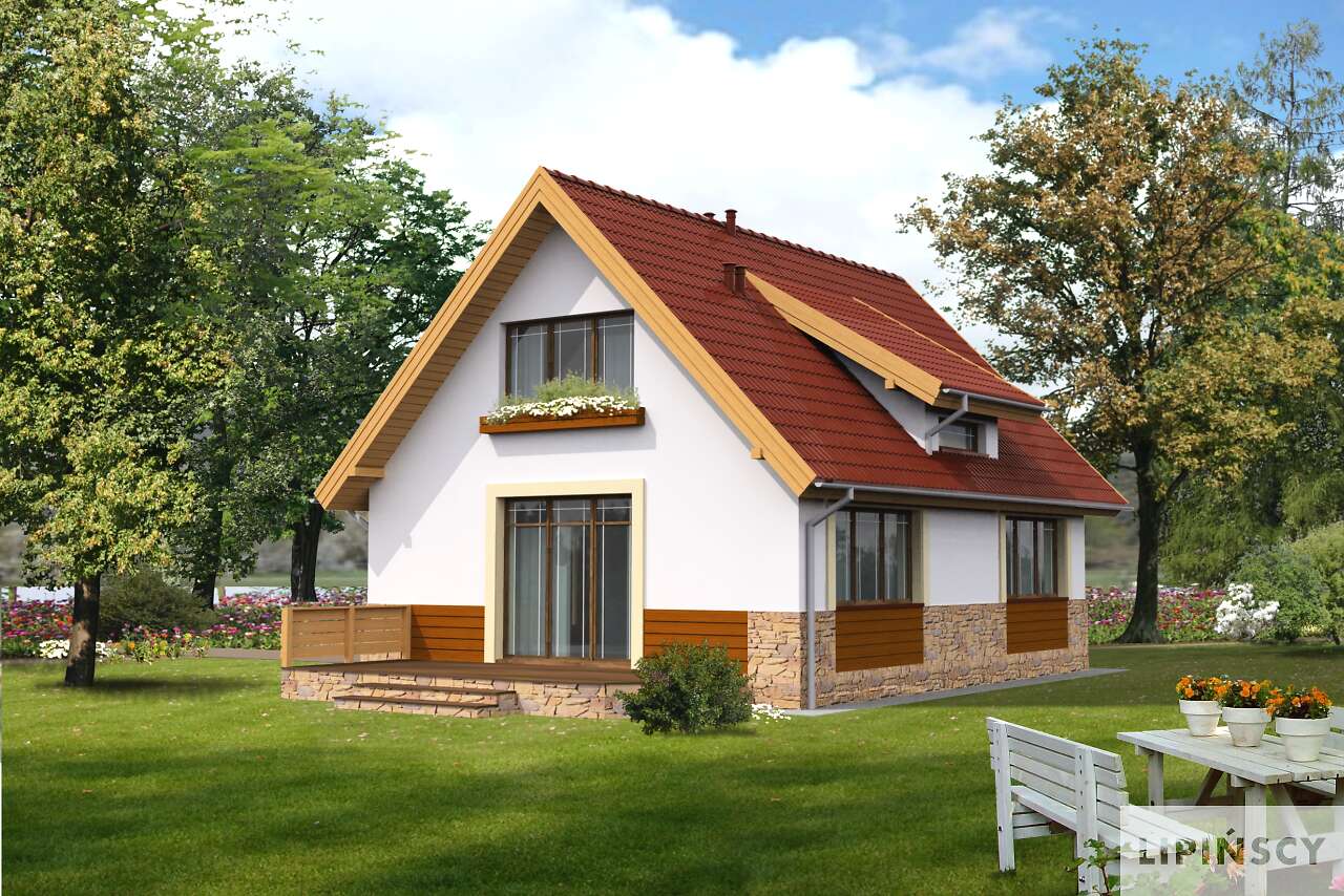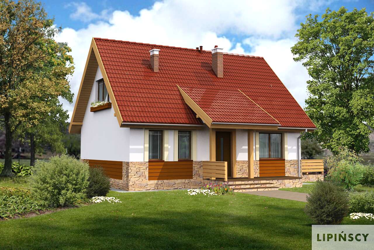 Niewielki, prosty w budowie dom z użytkowym poddaszem, o wygodnym i funkcjonalnie rozplanowanym wnętrzu. Na parterze znajduje się przestronna strefa wspólna – salon i otwarta na niego kuchnia z miejscem na rodzinny stół. Schody na poddasze, zlokalizowane w salonie, mogą być jego charakterystyczną ozdobą. Na parterze przewidziano także dodatkowy pokój – gabinet lub sypialnię, wygodną łazienkę i pomieszczenie gospodarcze. Poddasze kryje dwie ustawne sypialnie i łazienkę. Zlokalizowany z boku domu taras to doskonałe miejsce do wypoczynku na świeżym powietrzu.