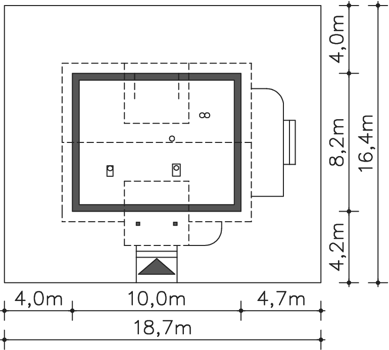 Grafika przedstawia minimalne wymiary działki. Aby sprawdzić, czy dom może być realizowany na konkretnej działce należy uzyskać Wypis i Wyrys z Miejscowego Planu Zagospodarowania Przestrzennego lub jeśli na danym terenie nie ma planu – Decyzję o warunkach zabudowy. Wszystkie projekty wymagają adaptacji do warunków miejscowych przez projektanta lokalnego.