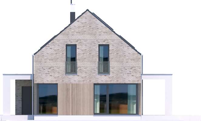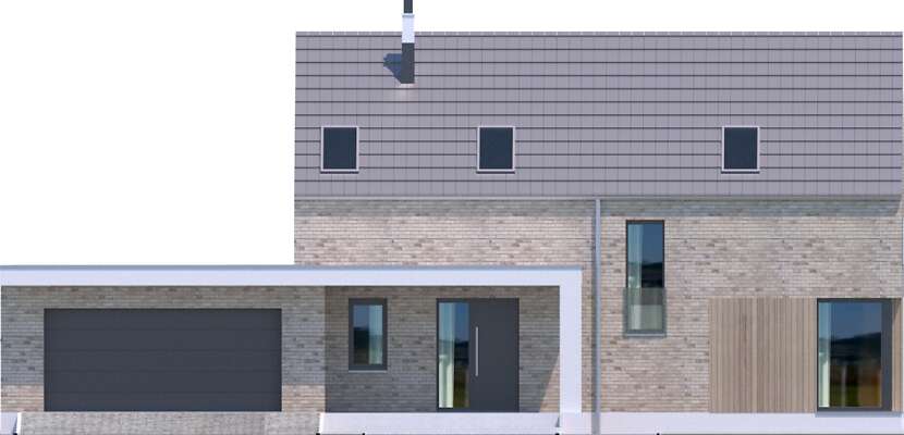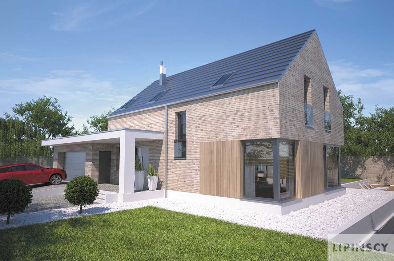 Projekt domu Newcastle to energooszczędny dom z użytkowym poddaszem, o rzucającym się w oczy wyglądzie w typie modnej nowoczesnej stodoły i o funkcjonalnie rozplanowanym wnętrzu. Ciekawie zaaranżowane wejście prowadzi do wiatrołapu, a stamtąd do wyraźnie wydzielonej części wspólnej, gdzie zlokalizowano piękny, przestronny salon, jadalnię i otwartą kuchnię. Na parterze znajduje się również kotłownia i toaleta. Poddasze mieści komfortową strefę Master Bedroom z dużą sypialnią posiadającą własną garderobę i łazienkę oraz jeszcze dwie ustawne sypialnie, wspólną garderobę bądź schowek, wygodną łazienka oraz pralnię. Garaż na dwa auta, który przewidziano jako dostawiony do budynku, dzięki płaskiemu dachowi nie powiększa optycznie całej bryły, natomiast sprawia, że jest ona bardziej urozmaicona. Ozdobą domu jest piękny taras od strony salonu oraz duże, narożne okna, dzięki którym wnętrze jest doskonale doświetlone światłem dziennym. Przyciągają one wzrok również od zewnątrz. Energooszczędne rozwiązania pozwalają na niskie zapotrzebowanie domu na energię, a co za tym idzie dom wybudowany wg projektu Newcastle będzie oszczędny i ekologiczny.