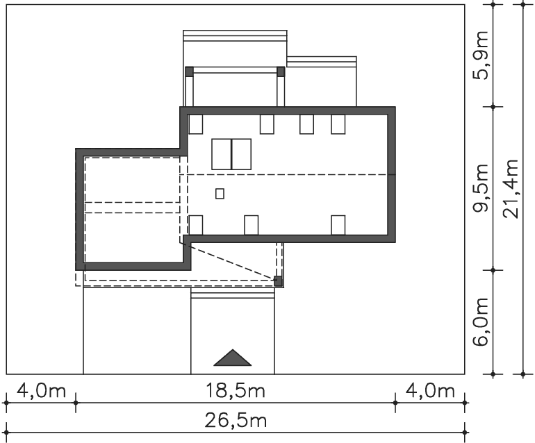 Grafika przedstawia minimalne wymiary działki. Aby sprawdzić, czy dom może być realizowany na konkretnej działce należy uzyskać Wypis i Wyrys z Miejscowego Planu Zagospodarowania Przestrzennego lub jeśli na danym terenie nie ma planu – Decyzję o warunkach zabudowy. Wszystkie projekty wymagają adaptacji do warunków miejscowych przez projektanta lokalnego.