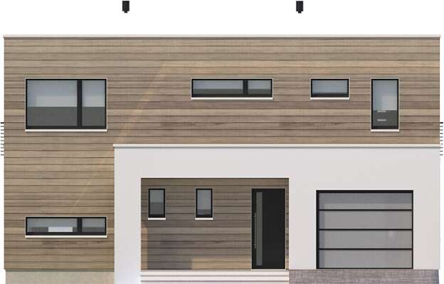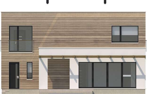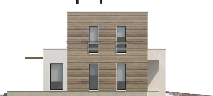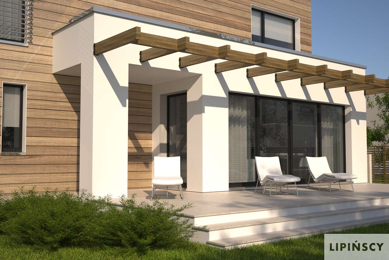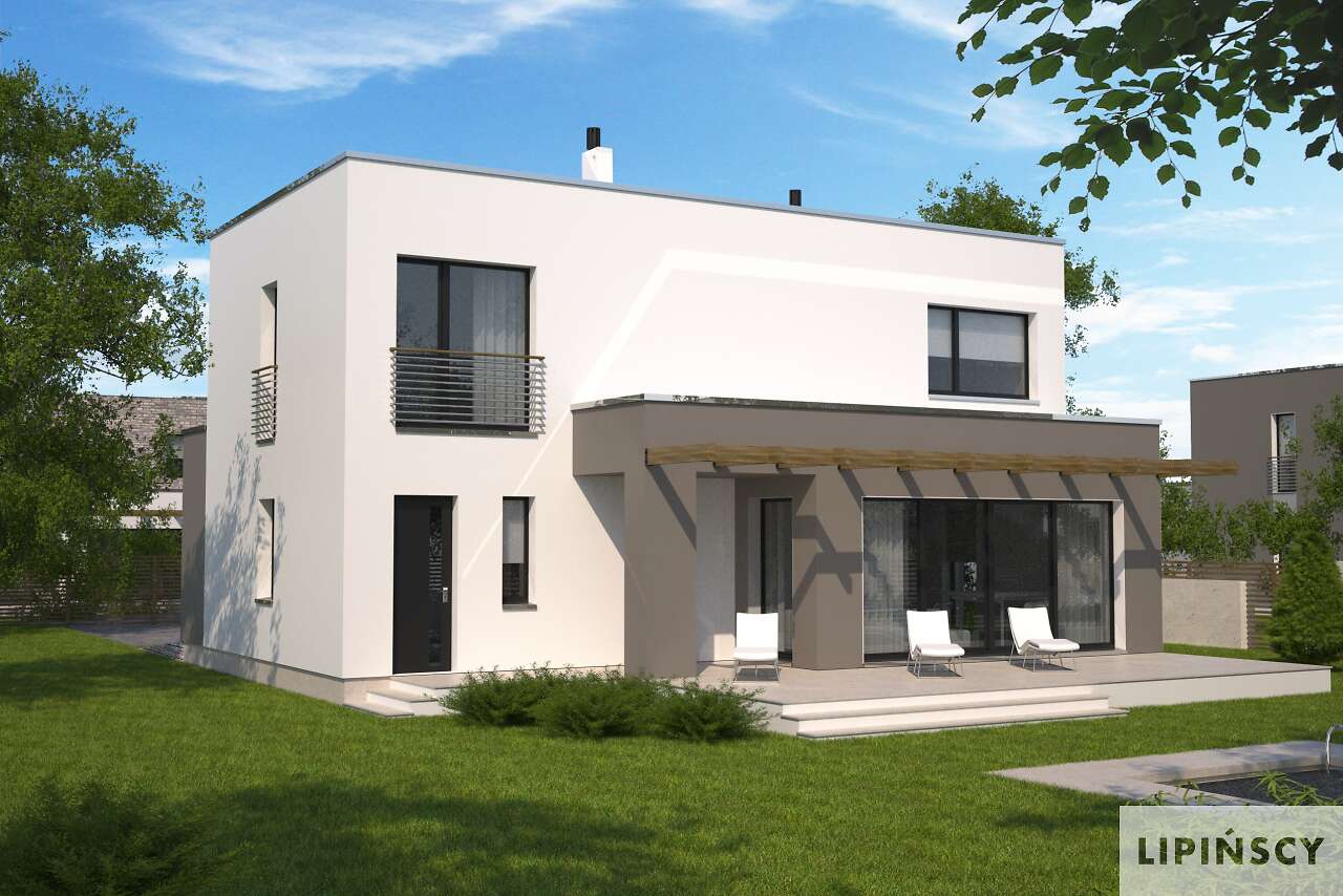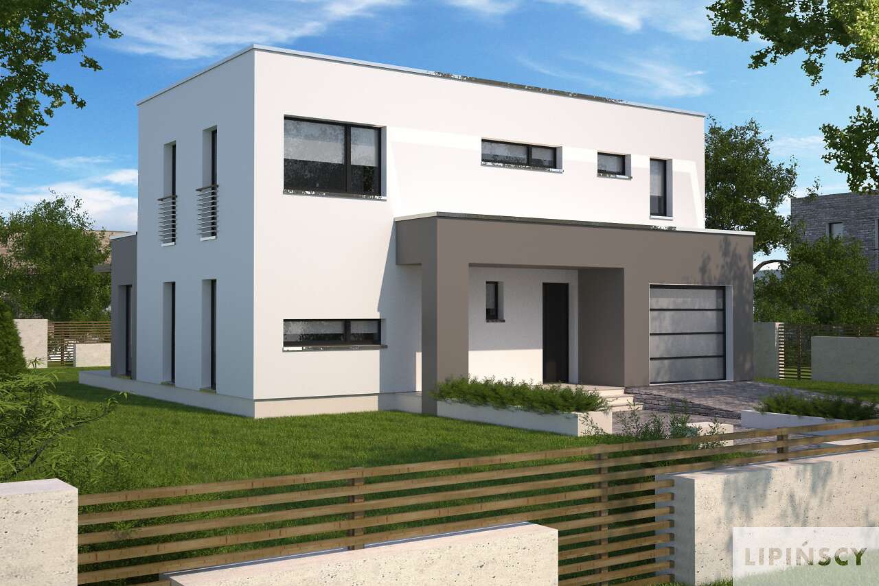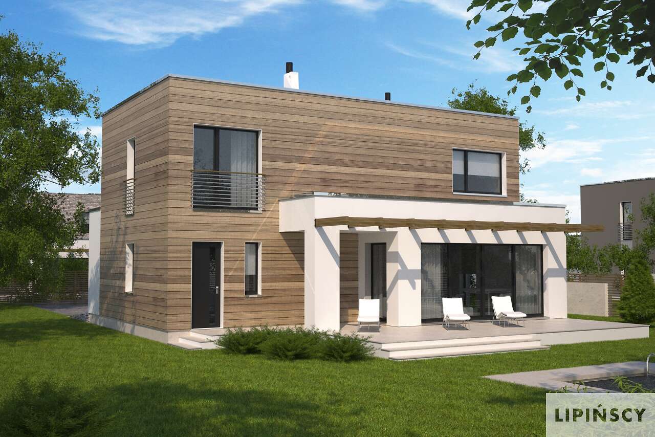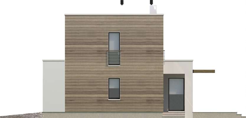 Nowoczesny dom energooszczędny z płaskim dachem, z wkomponowanym garażem na jedno auto. Parter zaadaptowano jako jedną, obszerną strefę wspólną, w skład której wchodzi kuchnia z wyspą, połączona z salonem z kominkiem. Poddasze to trzy sypialnie, w tym jedna z osobną łazienką oraz jedna duża, wspólna łazienka. Elewacja tego nowoczesnego domu może być wykonana w wielu wariantach, najlepiej wygląda z użyciem elementów z drewna i stali.