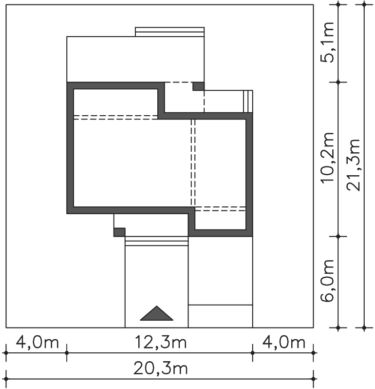 Grafika przedstawia minimalne wymiary działki. Aby sprawdzić, czy dom może być realizowany na konkretnej działce należy uzyskać Wypis i Wyrys z Miejscowego Planu Zagospodarowania Przestrzennego lub jeśli na danym terenie nie ma planu – Decyzję o warunkach zabudowy. Wszystkie projekty wymagają adaptacji do warunków miejscowych przez projektanta lokalnego.