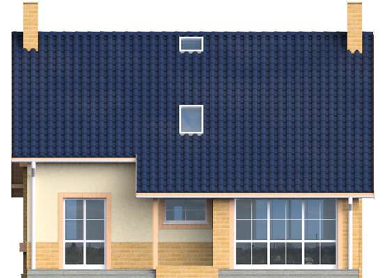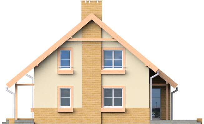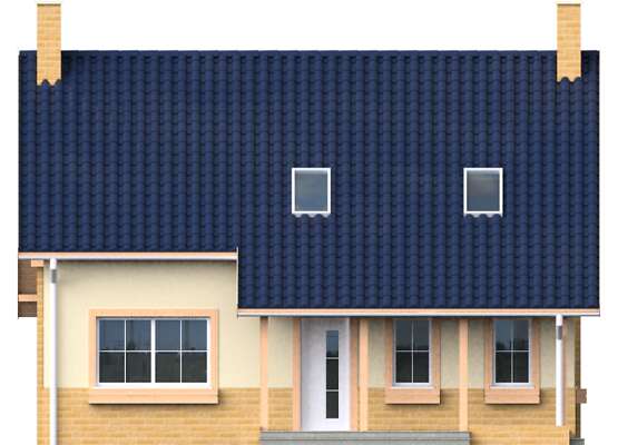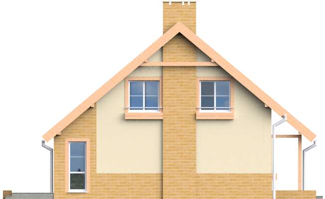 Wygodny dom z poddaszem dla rodziny 4-6 osobowej, przeznaczony na stosunkowo wąską działkę. Na parterze znajduje się zadaszony ganek, wiatrołap z szafami, hall, wc z prysznicem, pokój dzienny z kominkiem i wyjściem na zadaszony taras ogrodowy, kuchnia z kącikiem jadalni, wyjściem na ogród i pomieszczeniem gospodarczym z c.o, oraz dodatkowy pokój mogący w ramach potrzeb pełnić funkcję pokoju gościnnego, gabinetu lub pokoju dziadków. Schody umieszczone w hallu prowadzą na poddasze, gdzie umiejscowiono trzy przestronne sypialnie i łazienkę. Architektura domu jest prosta, harmonijna i elegancka. Dostępna jest wersja z garażem (LMP51).