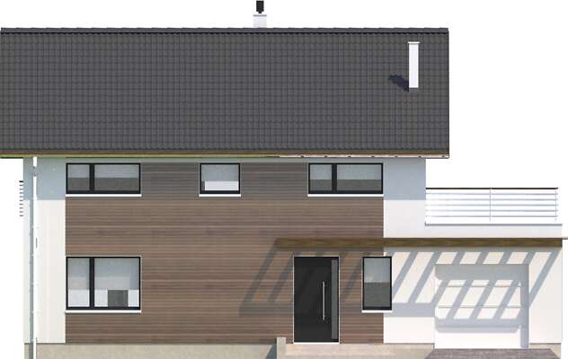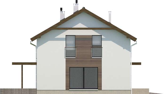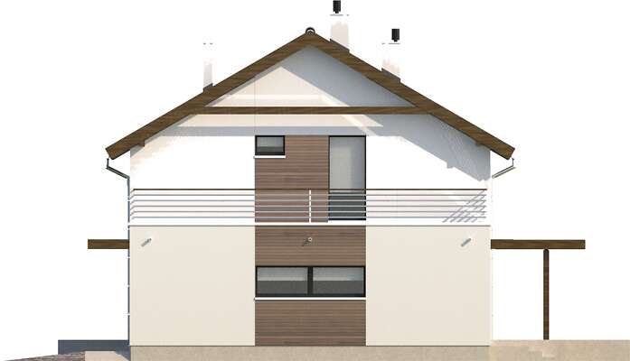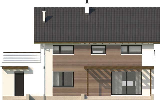 Wygodny dom energooszczędny z użytkowym poddaszem, kolejna wersja Nikko (DCP264), w której zrezygnowaliśmy z wykusza w pokoju dziennym oraz zaplanowaliśmy dodatkową sypialnię na poddaszu. Do dyspozycji mieszkańców jest więc część wspólna na parterze, z salonem z kominkiem, kuchnią ze spiżarnią, gabinetem, łazienką i wc oraz część nocna na poddaszu z czterema sypialniami, dwiema łazienkami i tarasem nad garażem. Zlokalizowana za garażem kotłownia ma niezależne wyjście na zewnątrz, a do garażu można wejść bezpośrednio z domu. Tras od strony ogrodowej został ozdobiony pergolą, która także chroni przed nadmiernym słońcem.
