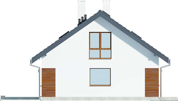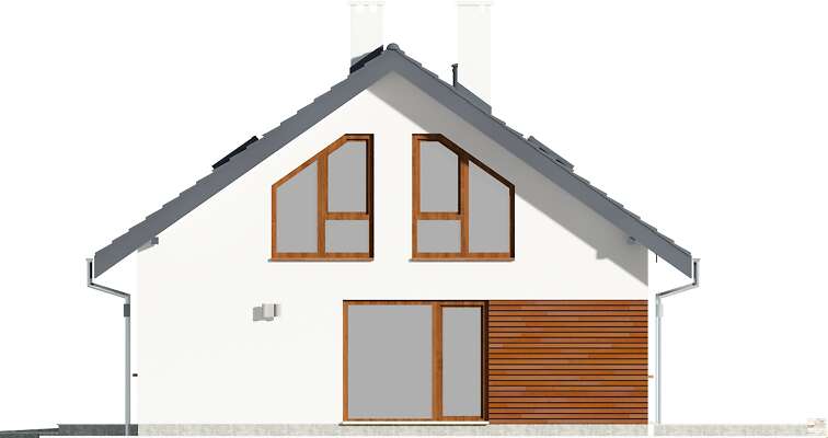 Piękny, prosty i funkcjonalny dom przeznaczony dla czteroosobowej rodziny. Sypialnia rodziców znajduje się na dole i posiada własną łazienkę, natomiast sypialnie dzieci zlokalizowane są na poddaszu. Na parterze mamy również przestronny salon połączony z kuchnią, spiżarnię i toaletę dla gości. Część gospodarczą stanowi dwustanowiskowy garaż, kotłownia i pralnia oraz strych nad garażem. W projekcie przewidziano ogrzewanie kotłem na gaz. Możliwa jest zmiana ogrzewania na pompę ciepła.